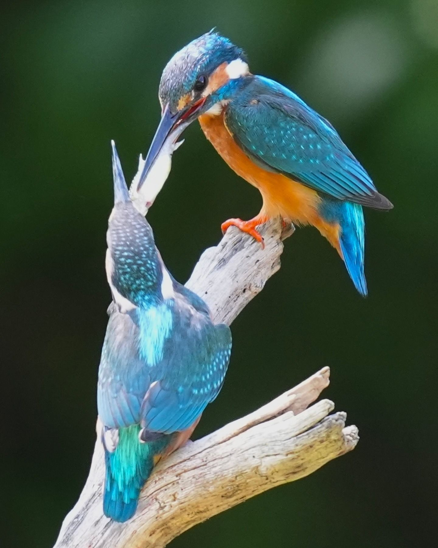 出てきたばかりの雛にお魚を給餌しているお父さんです
