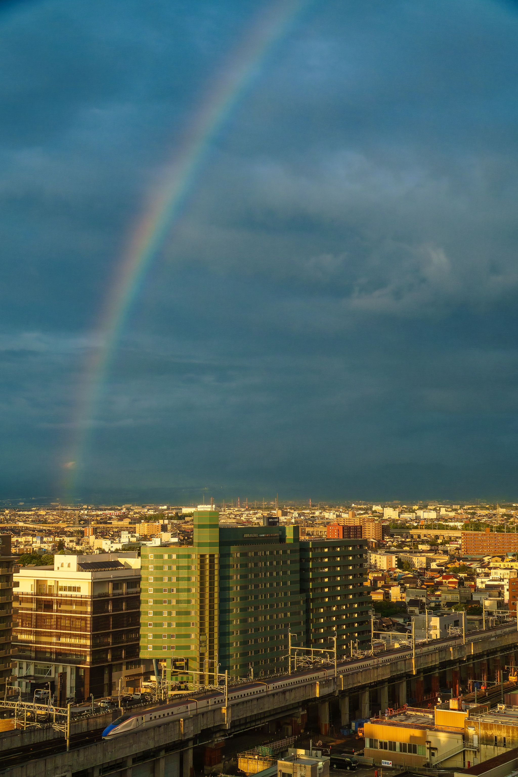 富山でホテルの部屋に入ったら虹が見えました。高層階だったので新幹線を入れて撮る事ができました。