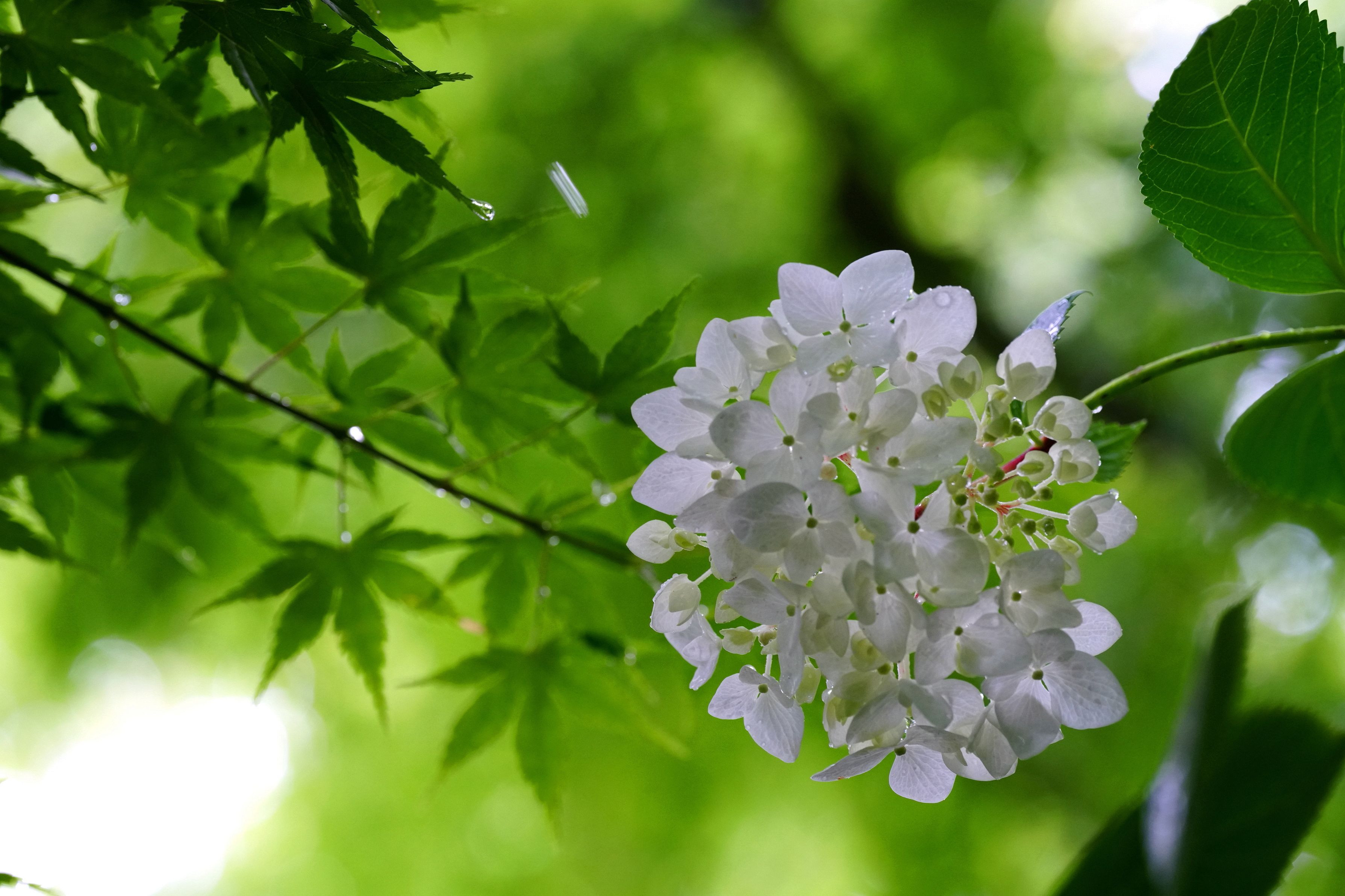モミジの木の下に隠れる様に咲く紫陽花、モミジの一枝が日除けと雨除けを受けて一輪咲き誇る