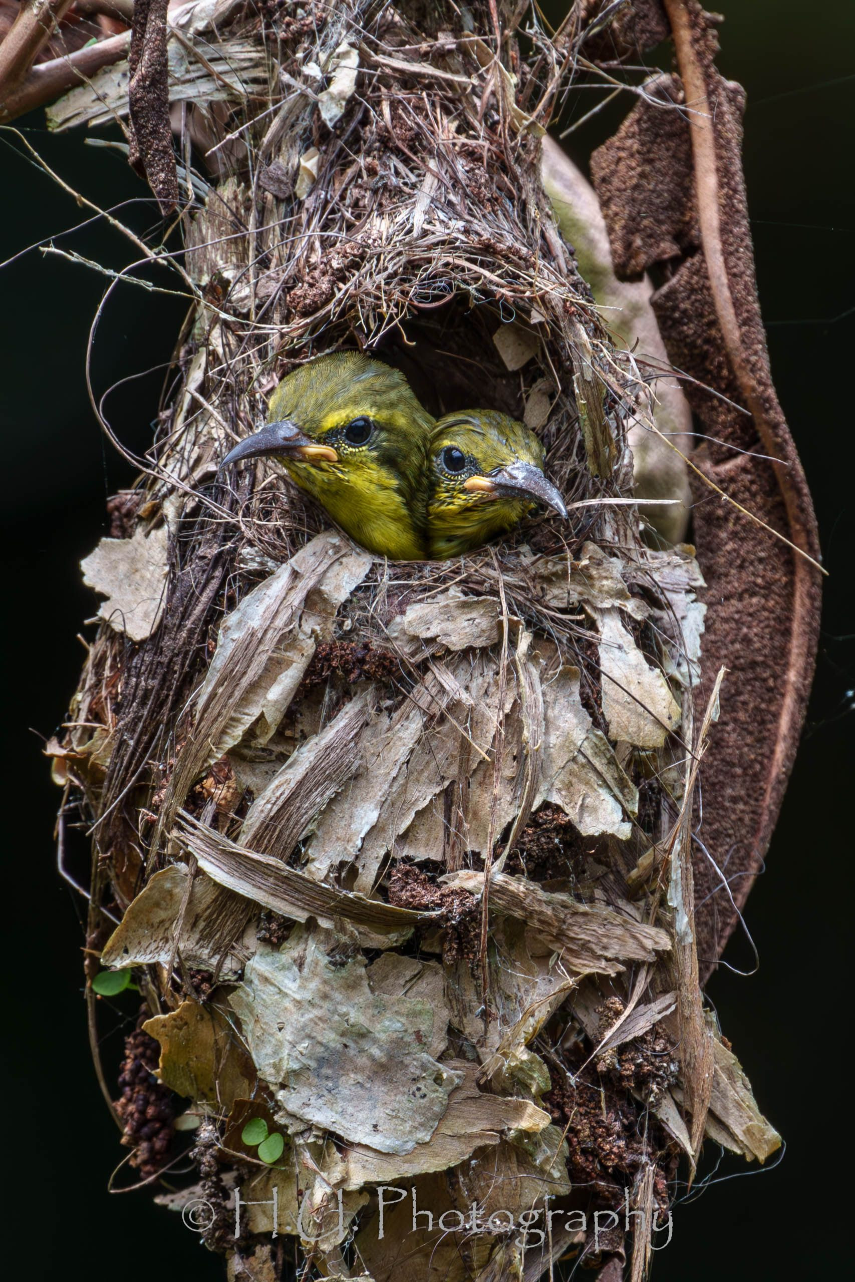 キバラタイヨウチョウ (Olive-backed Sunbird) シンガポールでは一番よくみられるタイヨウチョウの幼鳥です。 きょうだいで仲良く親を待っているようです。