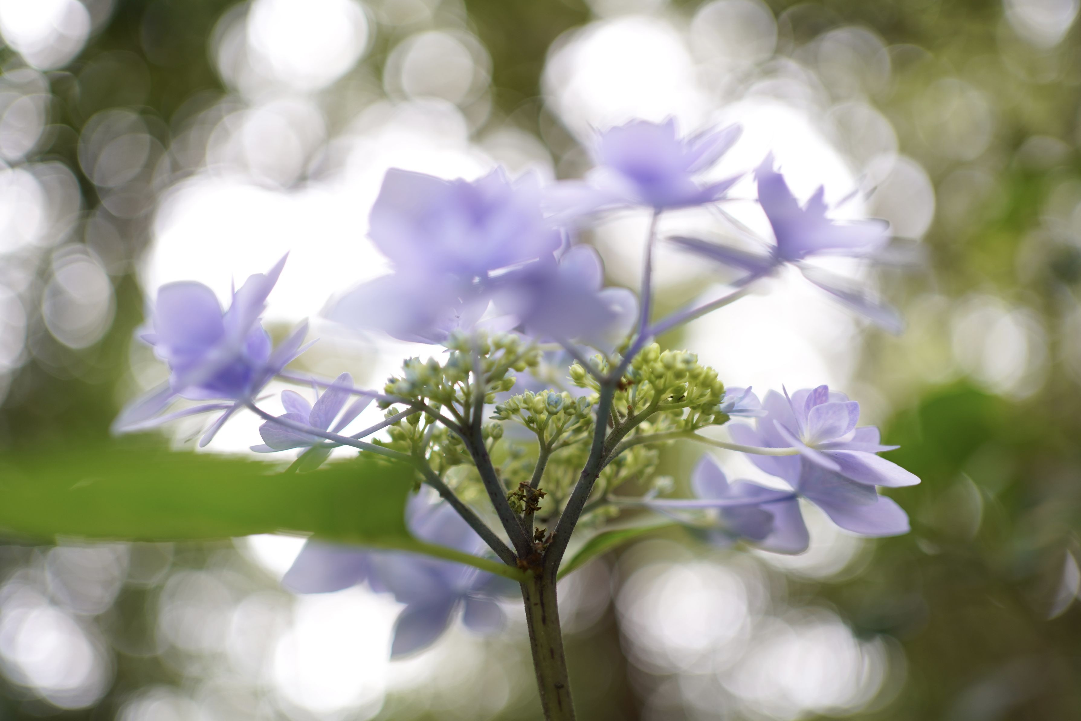 明石、住吉神社の紫陽花苑でキラキラと光の中で輝いていた紫陽花をピントを茎に合わせて撮りました