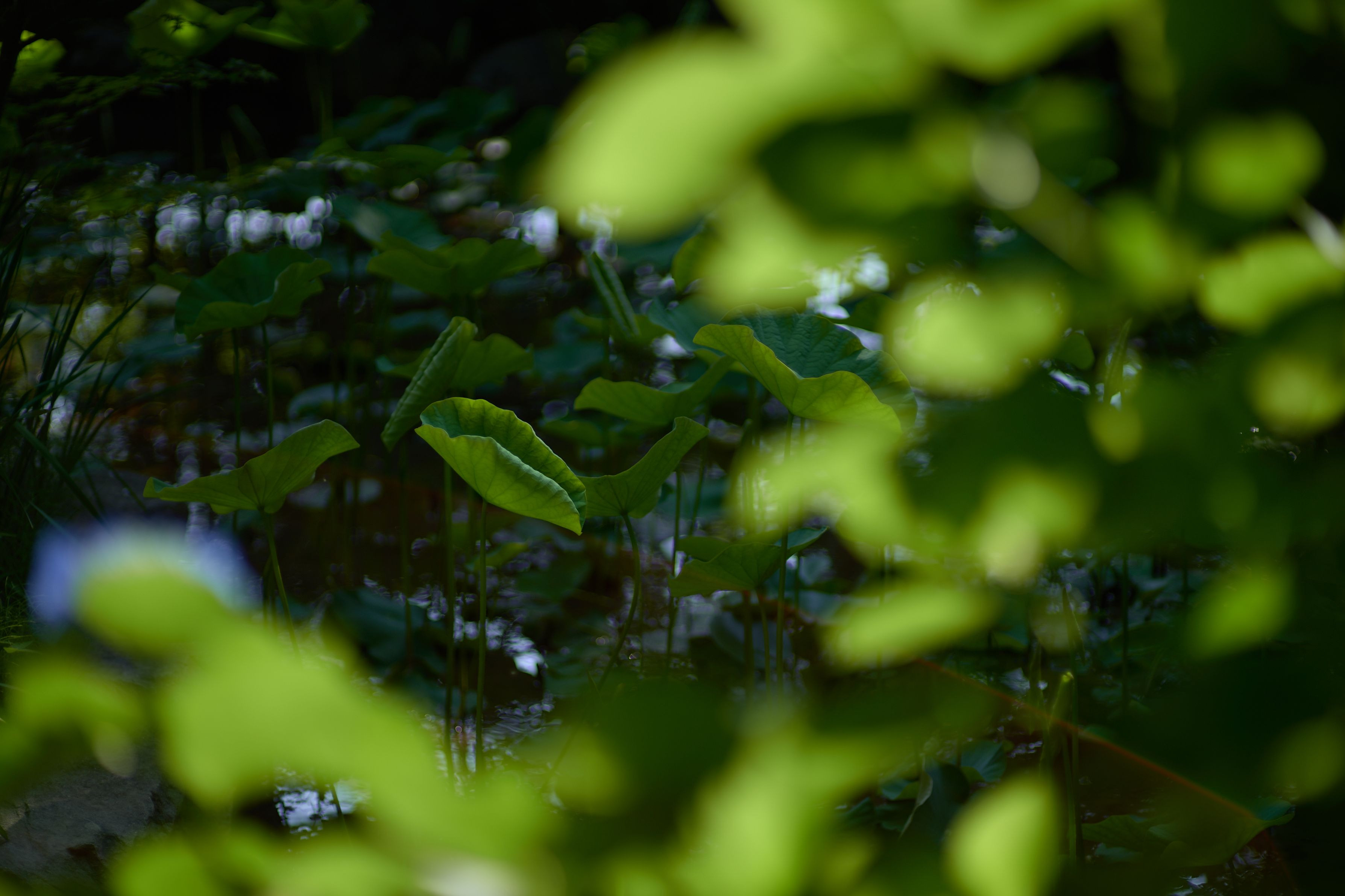 木立の中の小さな蓮池 柔らかそうな若い葉に”しっかり育って綺麗な花を咲かして”と応援しました:-)