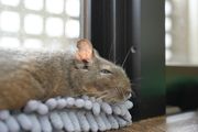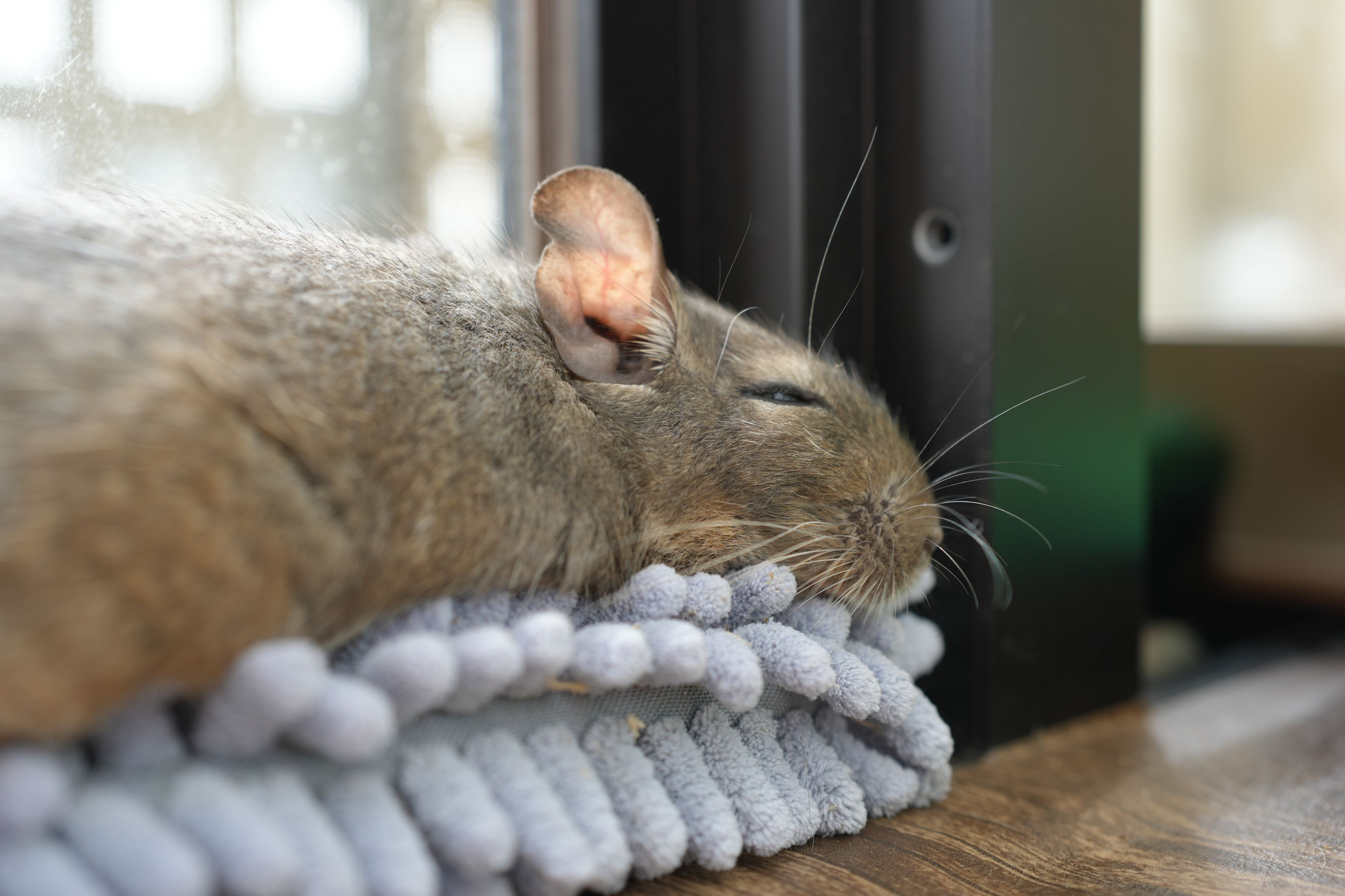 ハンディモップの上でお昼寝中。 デグーのふぶき丸は完全にダラけてます。