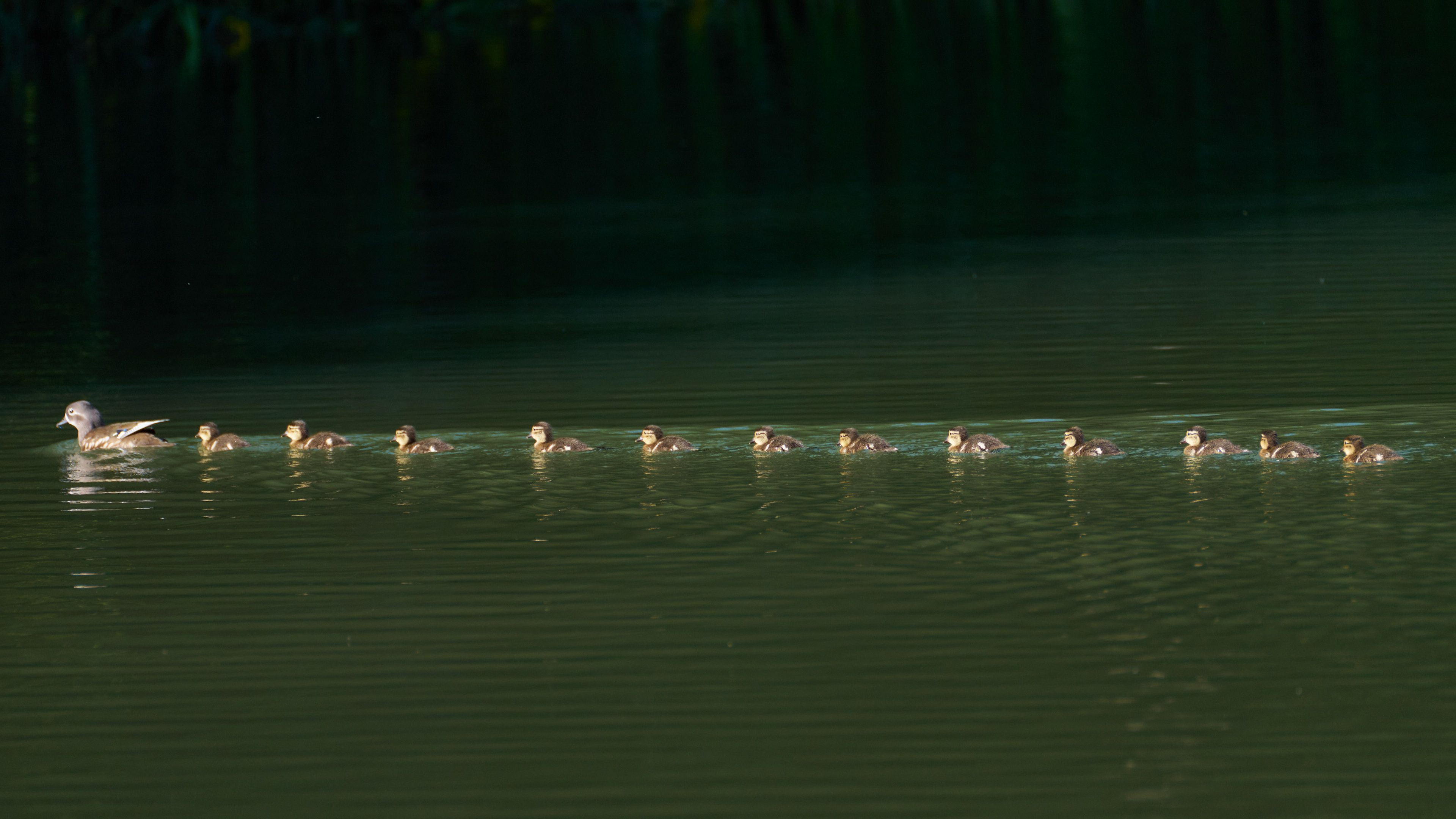 札幌市の中島公園で、オシドリのヒナ12羽全員が1列になった瞬間です。