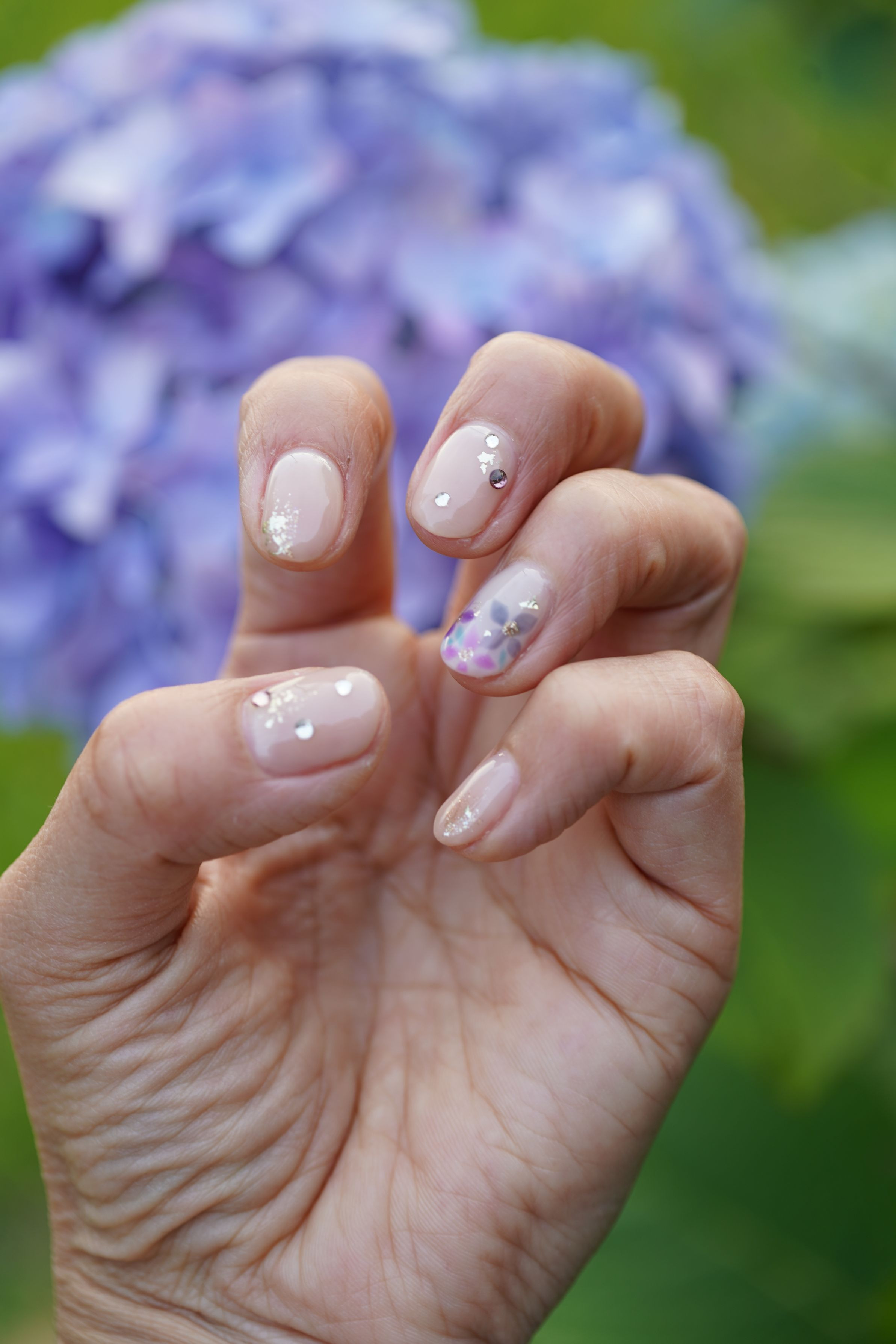 紫陽花にストーンは雫に見立てて施術していただきました