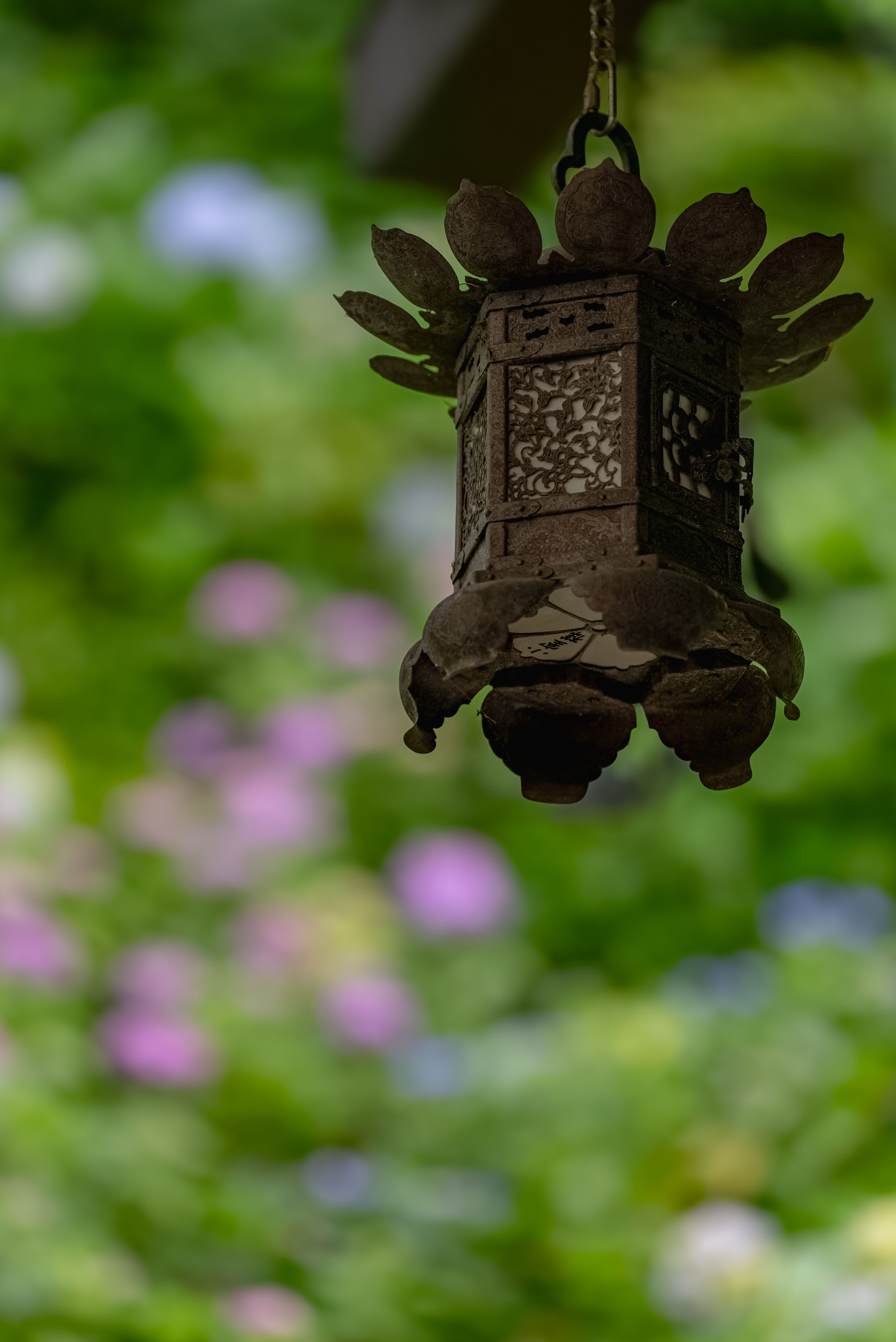 鎌倉 長谷寺の「あじさい路」入り口近くの斜面には色とりどりの紫陽花が咲いていた。その斜面を背に回転式書架で知られている「経蔵」が建っており、軒下には、古びた六角釣燈龍が吊り下げられていた。釣燈龍を見上げる先に、綺麗な紫陽花が見える景色だ。