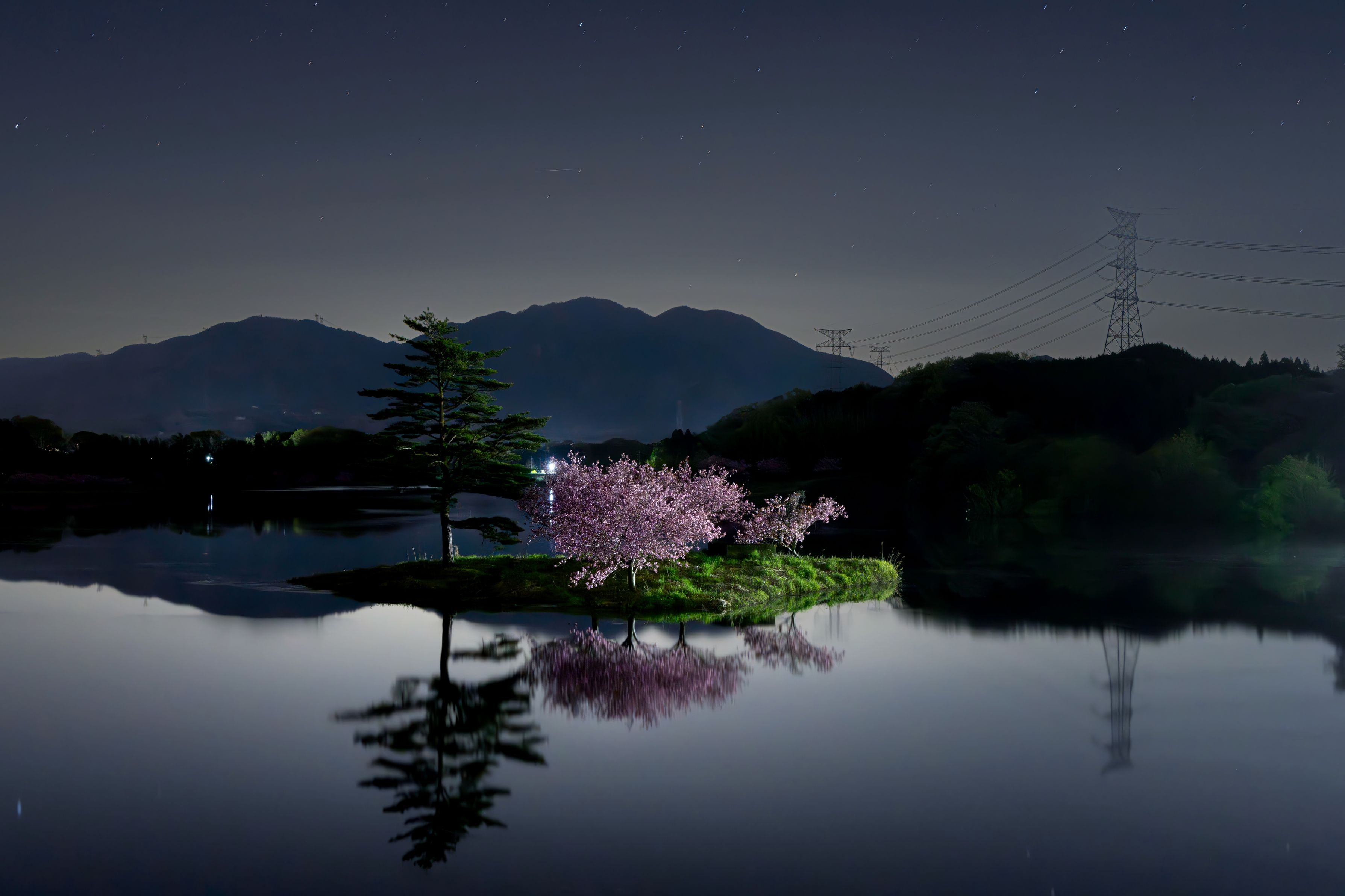 ダムの監視灯が浮島の八重桜に程よく当たり、あたかもライトアップされているような幻想的な光景です。