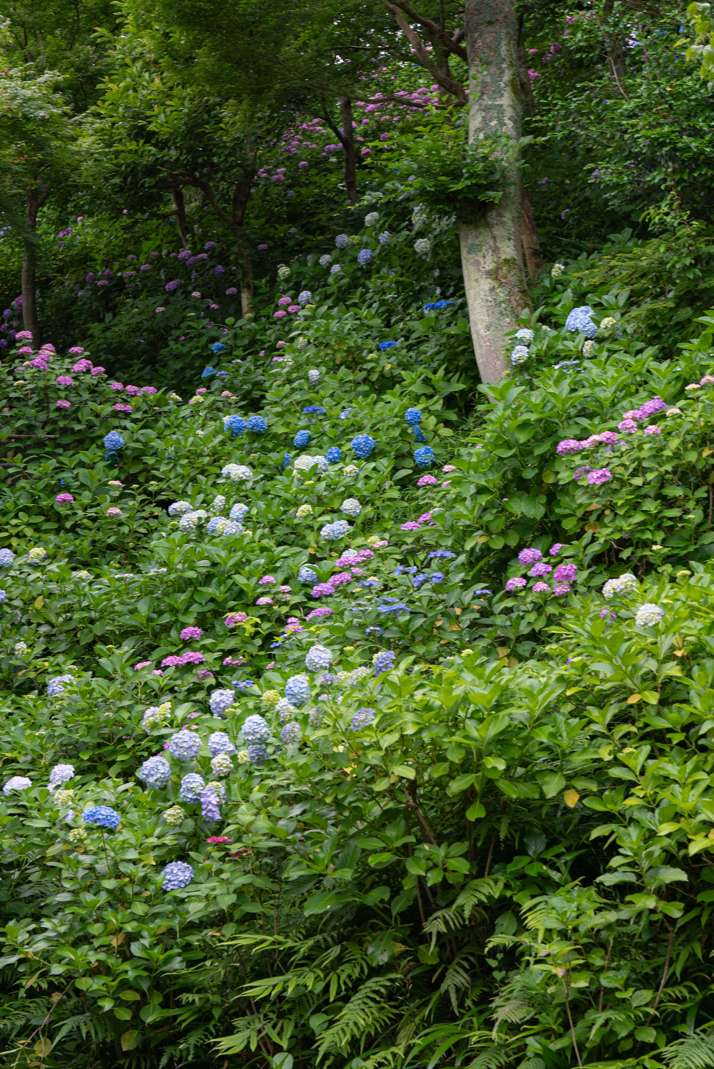 足を止め、振り返り眺めた頭上の景色。どこまでも続くあじさいの景色に、あらためて「あじさいの杜」と再認識。 (鎌倉 長谷寺)