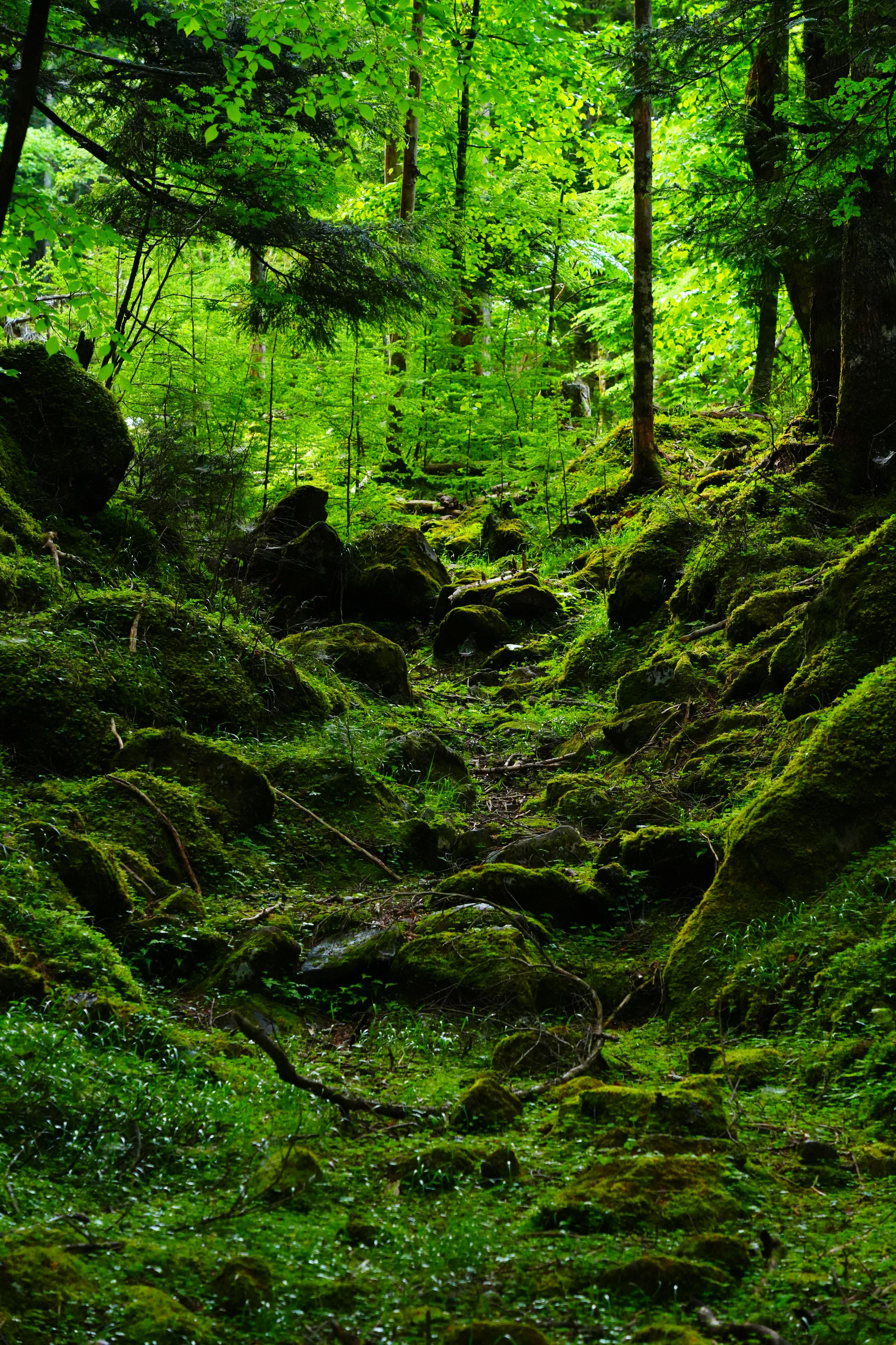 南八ヶ岳の森の中。早朝に降った小雨が苔をぬらし、陽の光が入ったことで瑞々しさが生まれました。梅雨にしか見られない景色で、雨の日も悪くないなと思います。