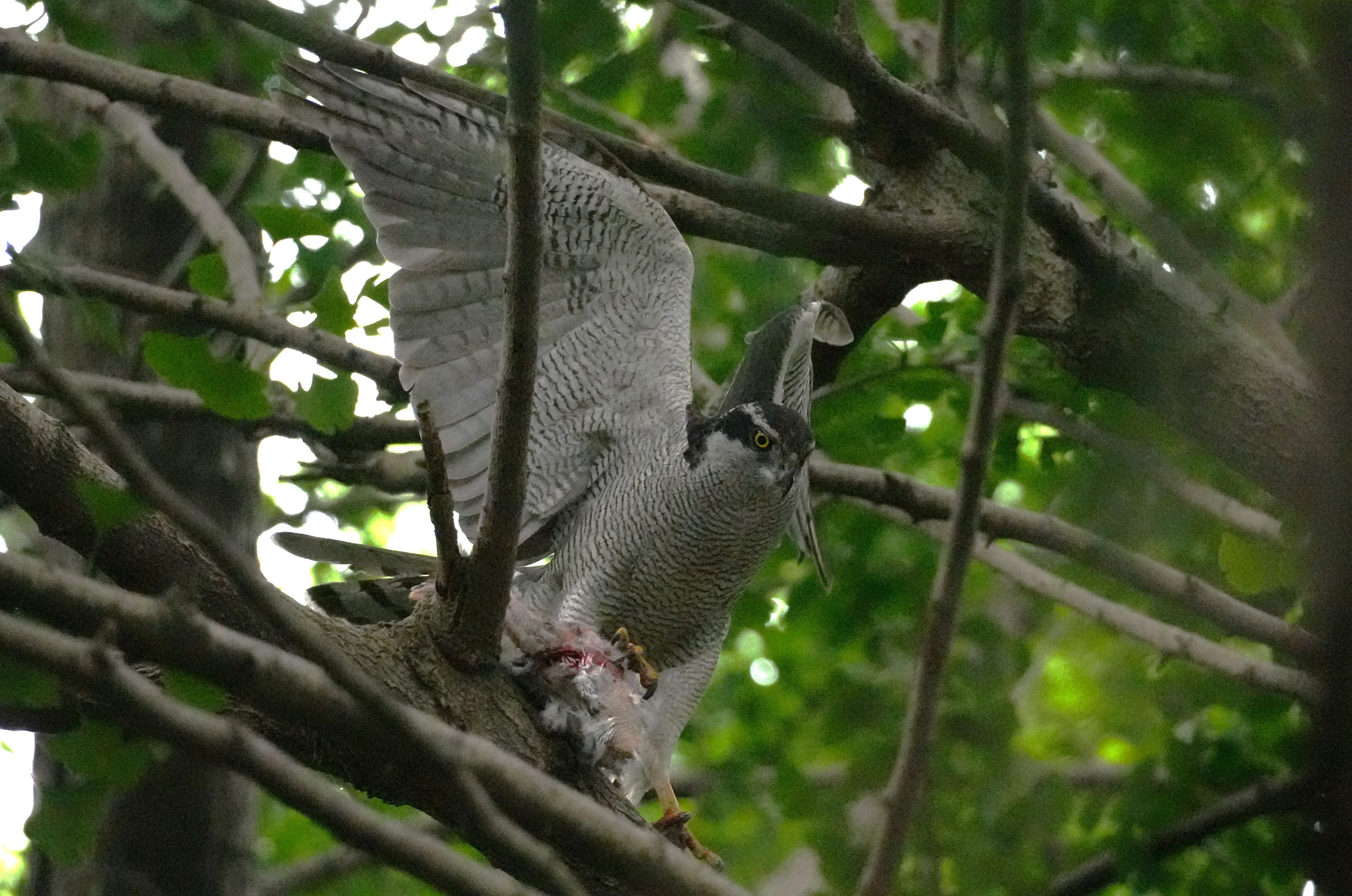 子育て中のオオタカです。獲物(ドバト)の羽根をすべてむしり、これから雛の待つ巣へ運ぶところです。