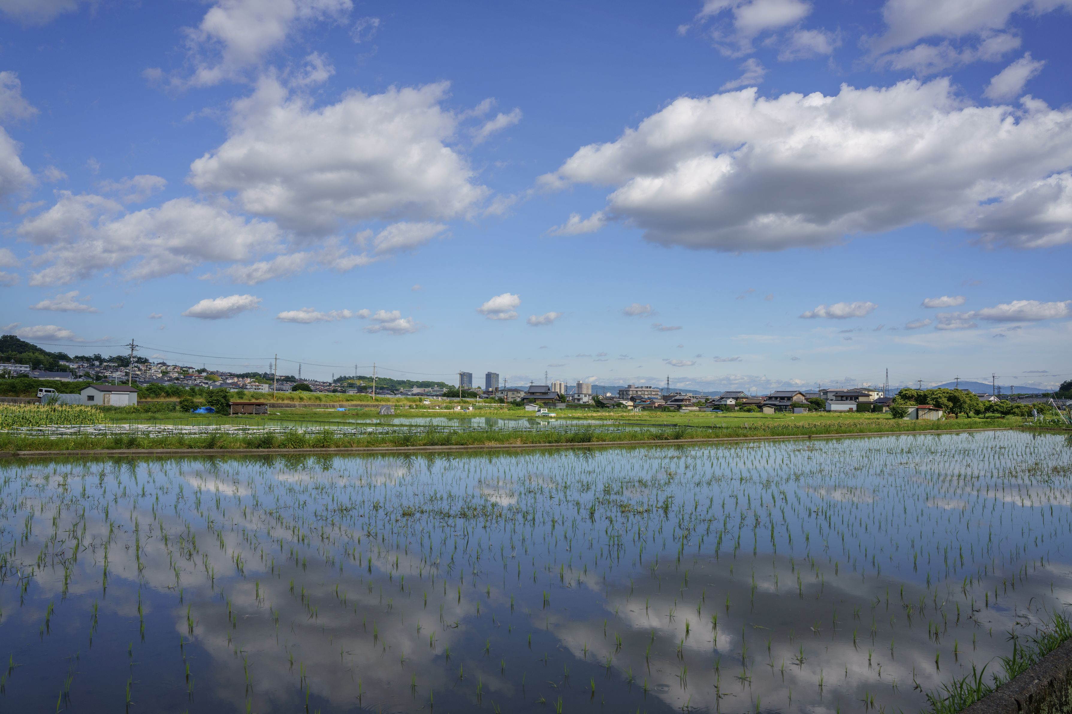 梅雨の合間に撮った水鏡。 この場所からバスで10分+電車で15分で京都・大阪駅に出れる、まさしく「都会と田舎の間」といった場所での1枚です。