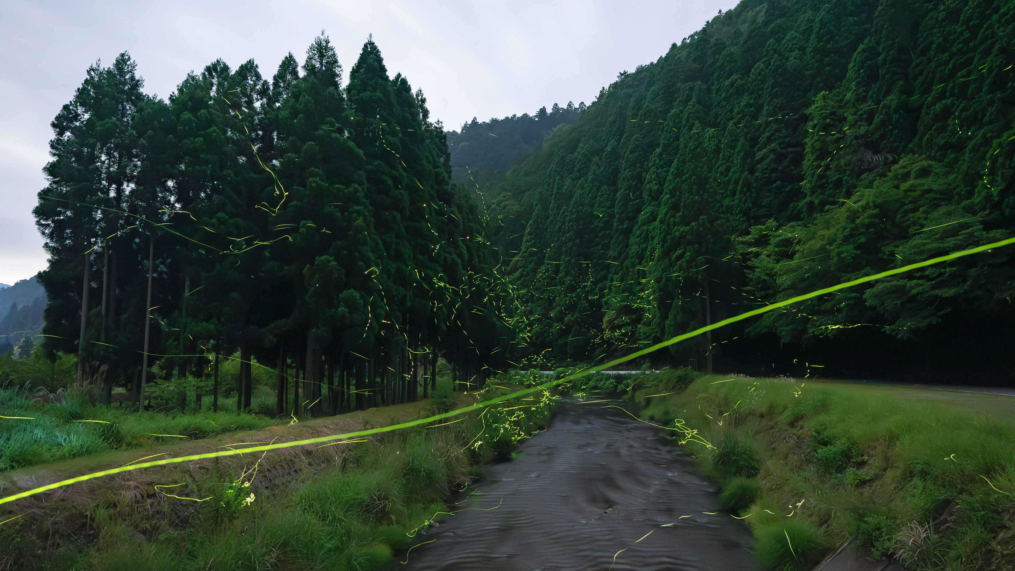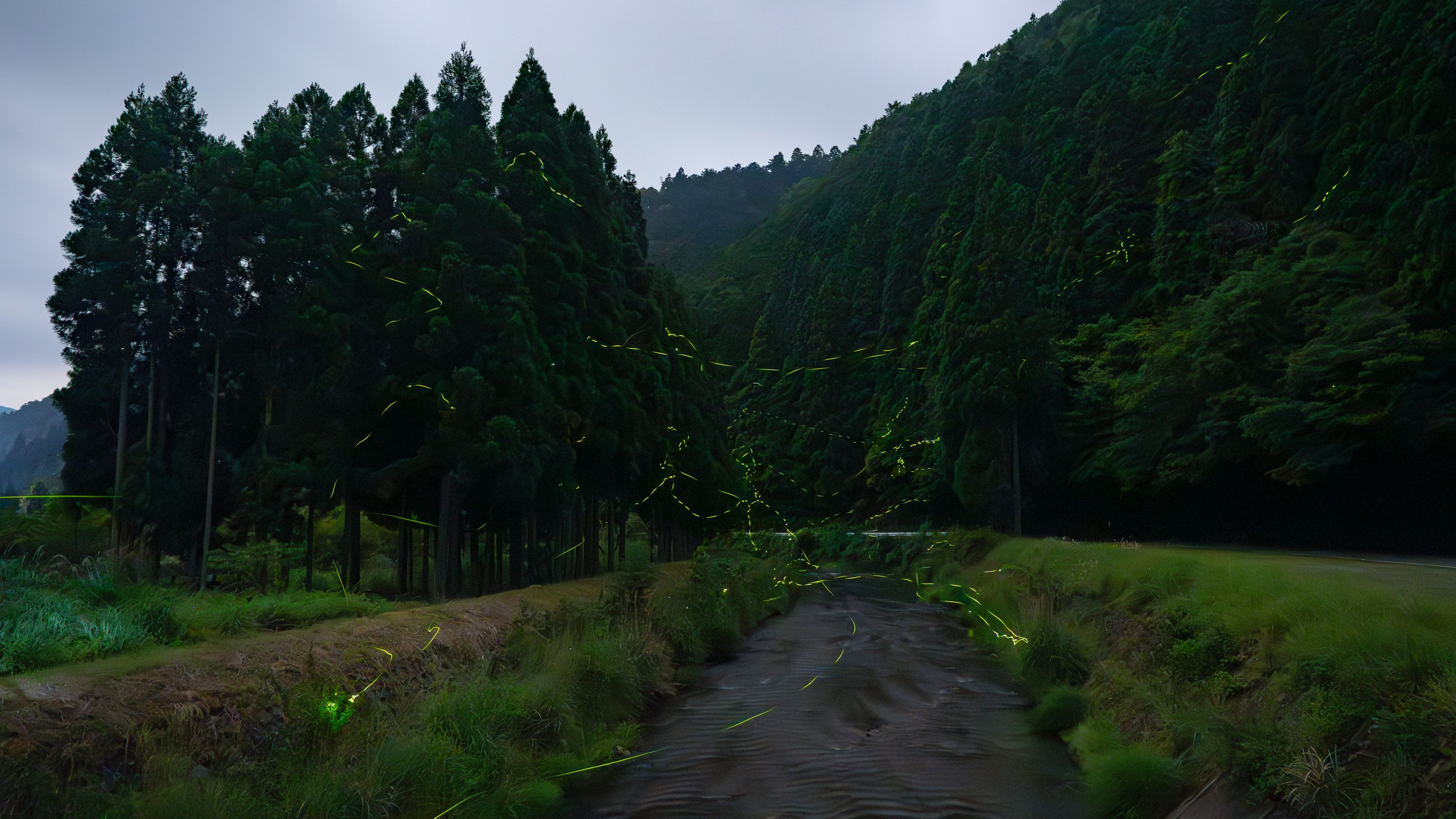 今年の蛍は昨年より少ないのか、遅れてこれから増えるのか分かりません。 1枚目は5枚を明合成したもので、壁紙用に作製しました。 最初は10枚合成しようと思っていたのですが、5枚が適量かと… 2枚目は1枚です。昨年の半分ぐらいの数ではないかと思います。 それでも充分美しい光景です!