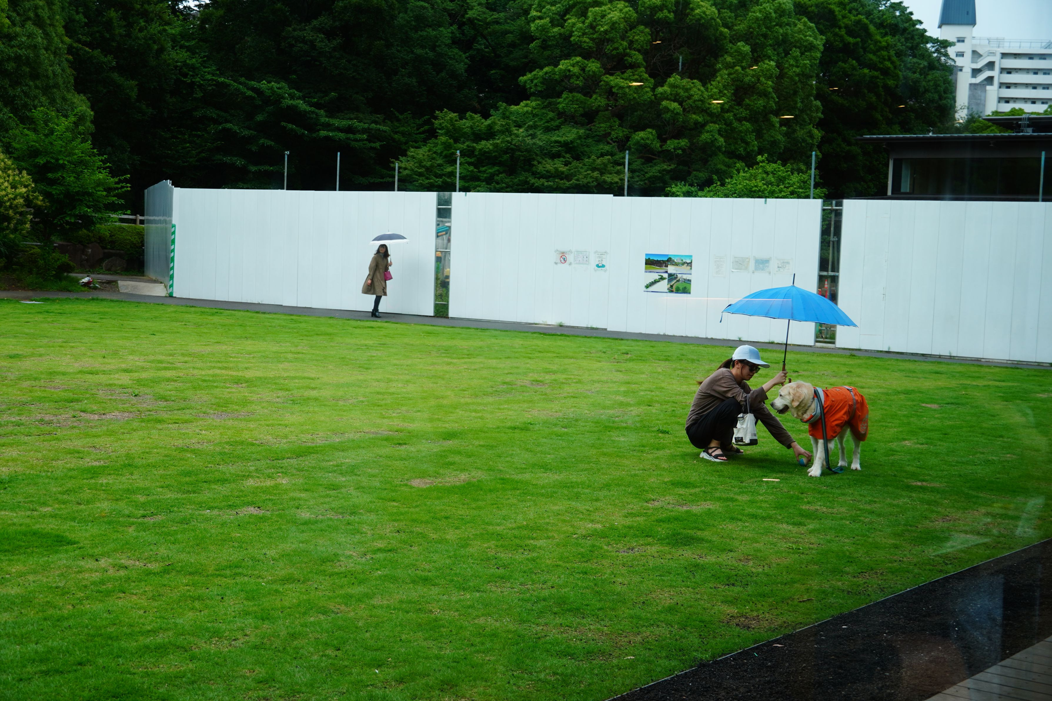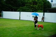 美しい緑の芝生。養生をおえたばかりの芝生です。そこへワンチャンが。何だか、遠くに絵を見ているようでした。