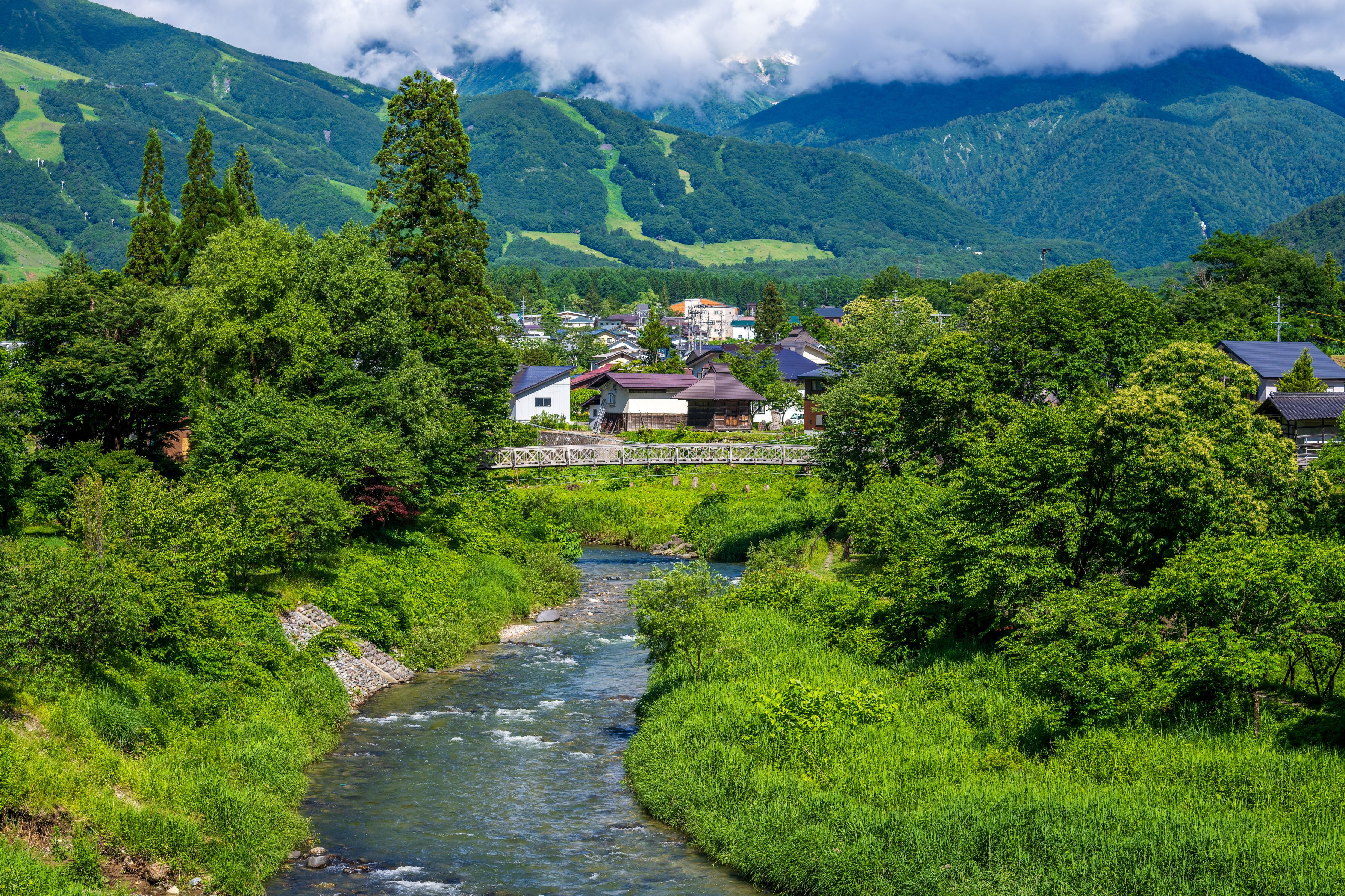 生憎、山は雲がかかっていて見えませんでしたが、川のせせらぎが気持ちよかったです。