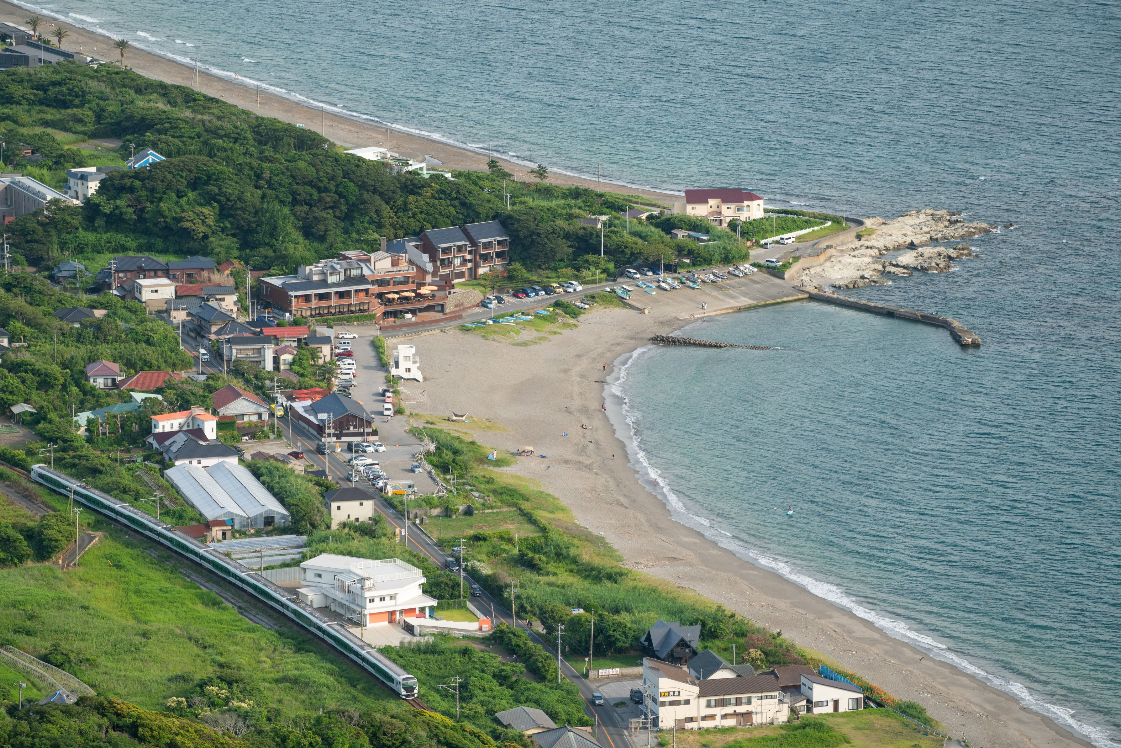 鋸山から保田海水浴場方面を望む。かつて海水浴客で賑わっていたであろう浜辺はひっそりとしていて、房総特急も減ってしまいました。時代の流れを感じずにはいられません。