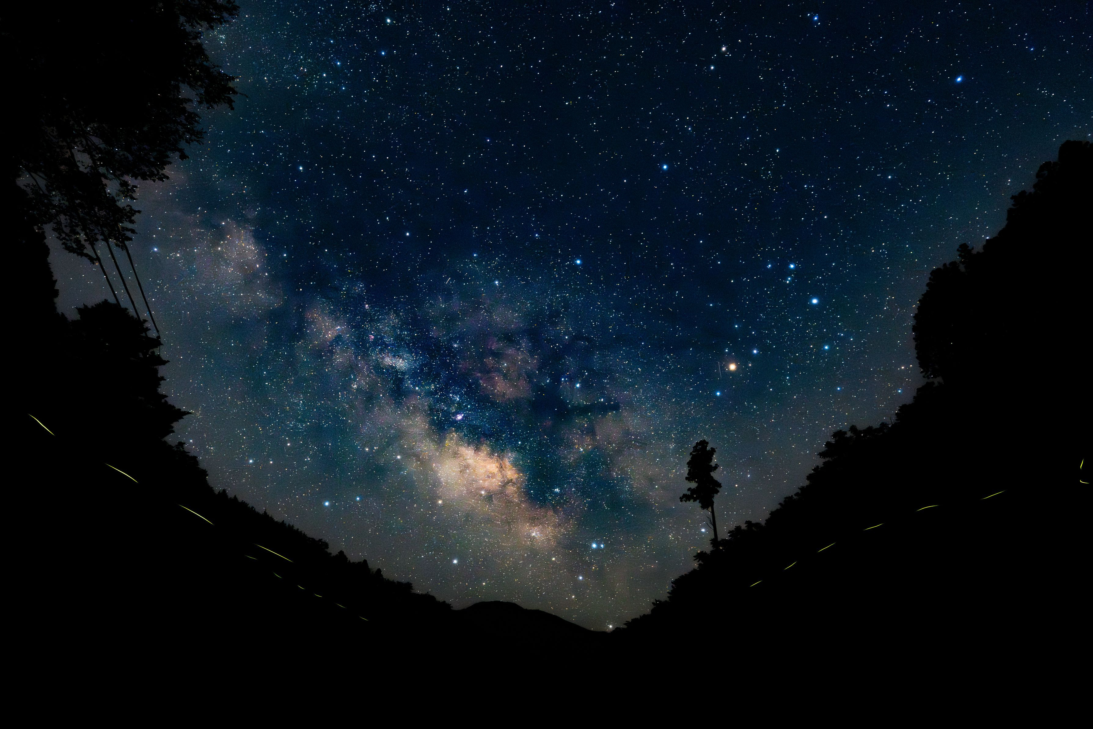 梅雨の晴れ間に奈良県野迫川村の川沿いで撮影しました。川沿いに蛍が舞っているので流れ星のようで幻想的な夜でした。