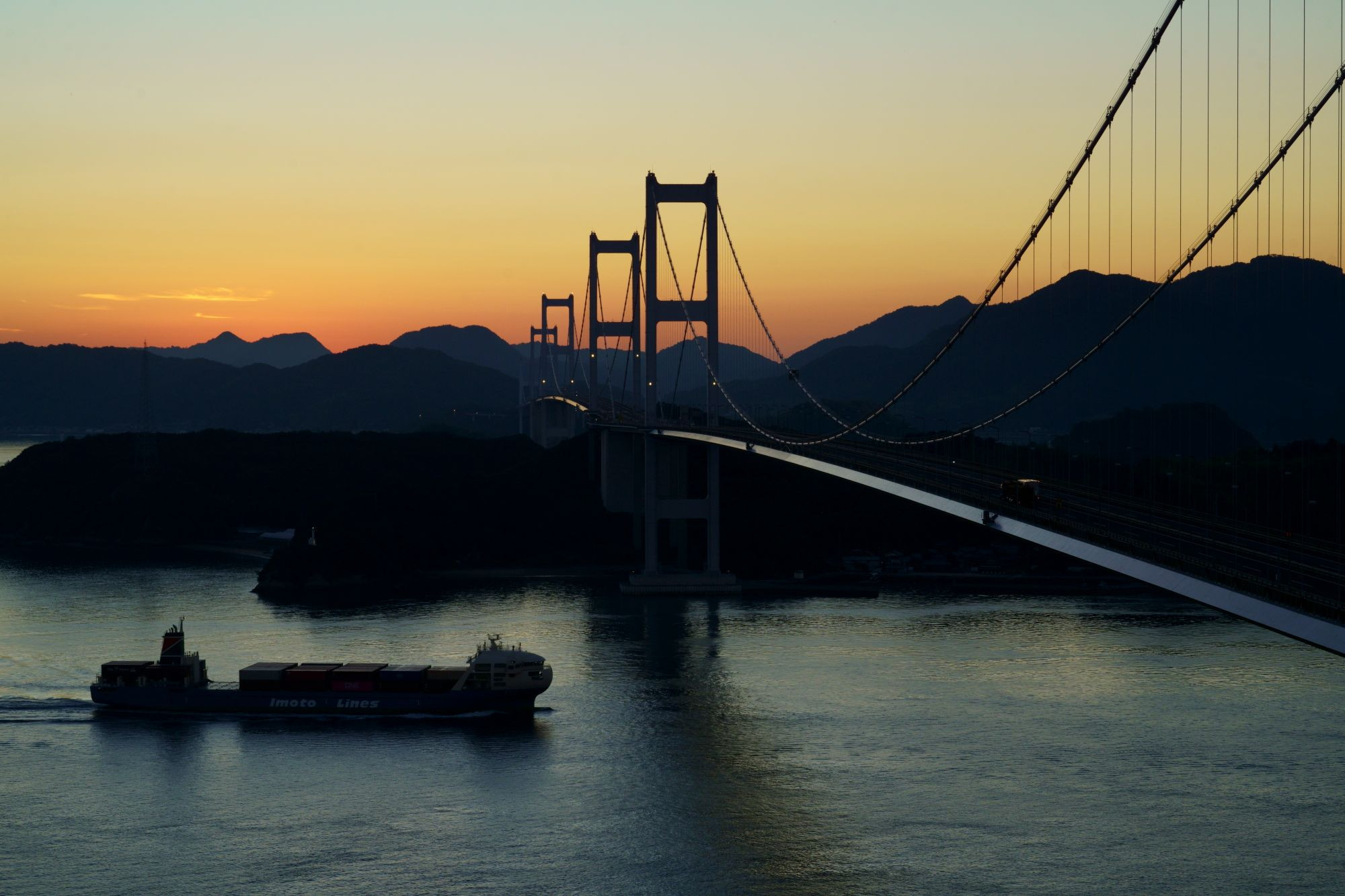 来島海峡 橋の下を貨物船が