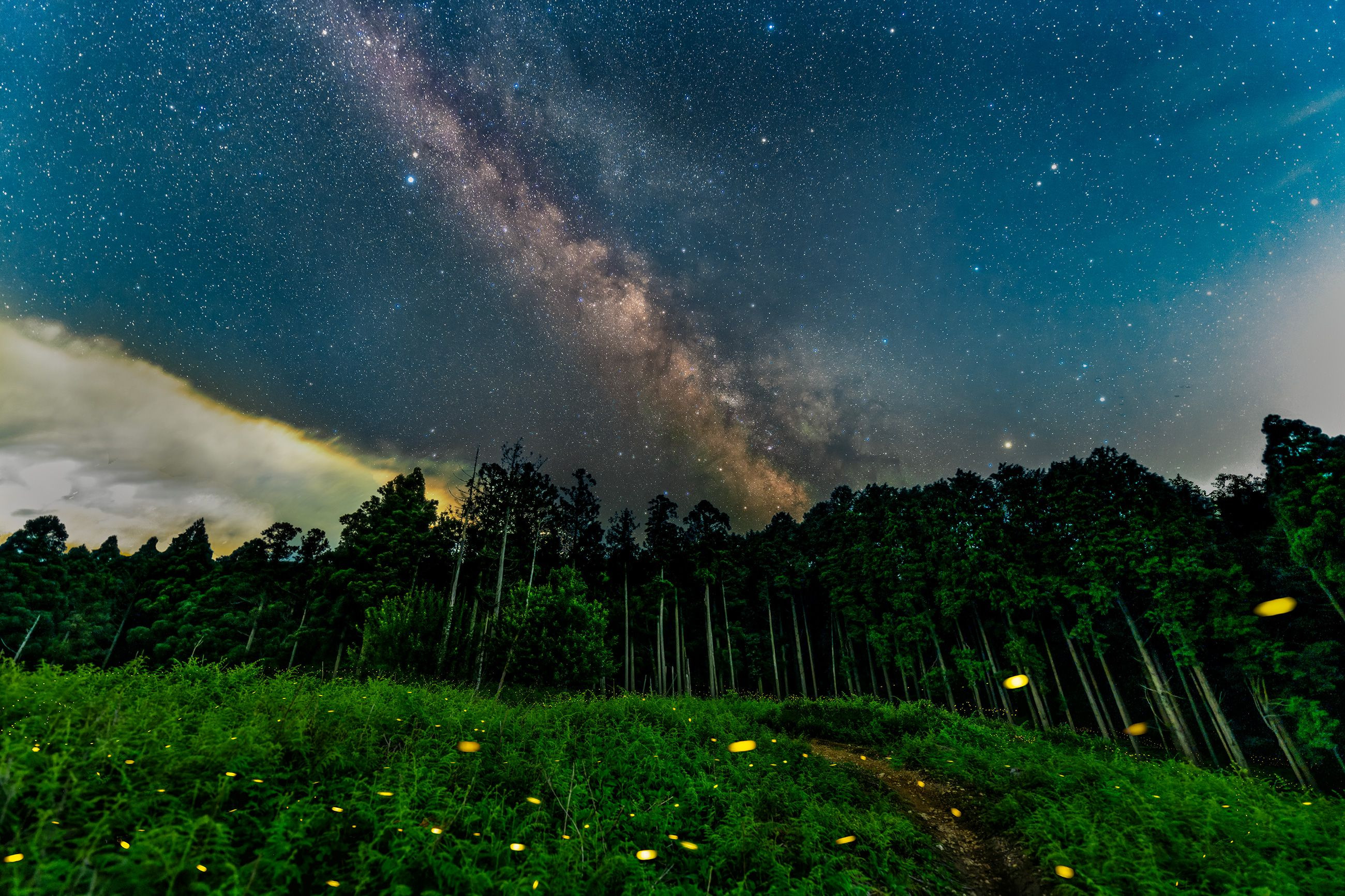 なかなかスカッと晴れず雲はあれど天の川とヒメボタルをやっと撮ることができました。 天の川はポタ赤で追尾、景色は静止状態で撮影、ヒメボタルは比較明。 α7RV・SIGMA14mmF1.4DGDN