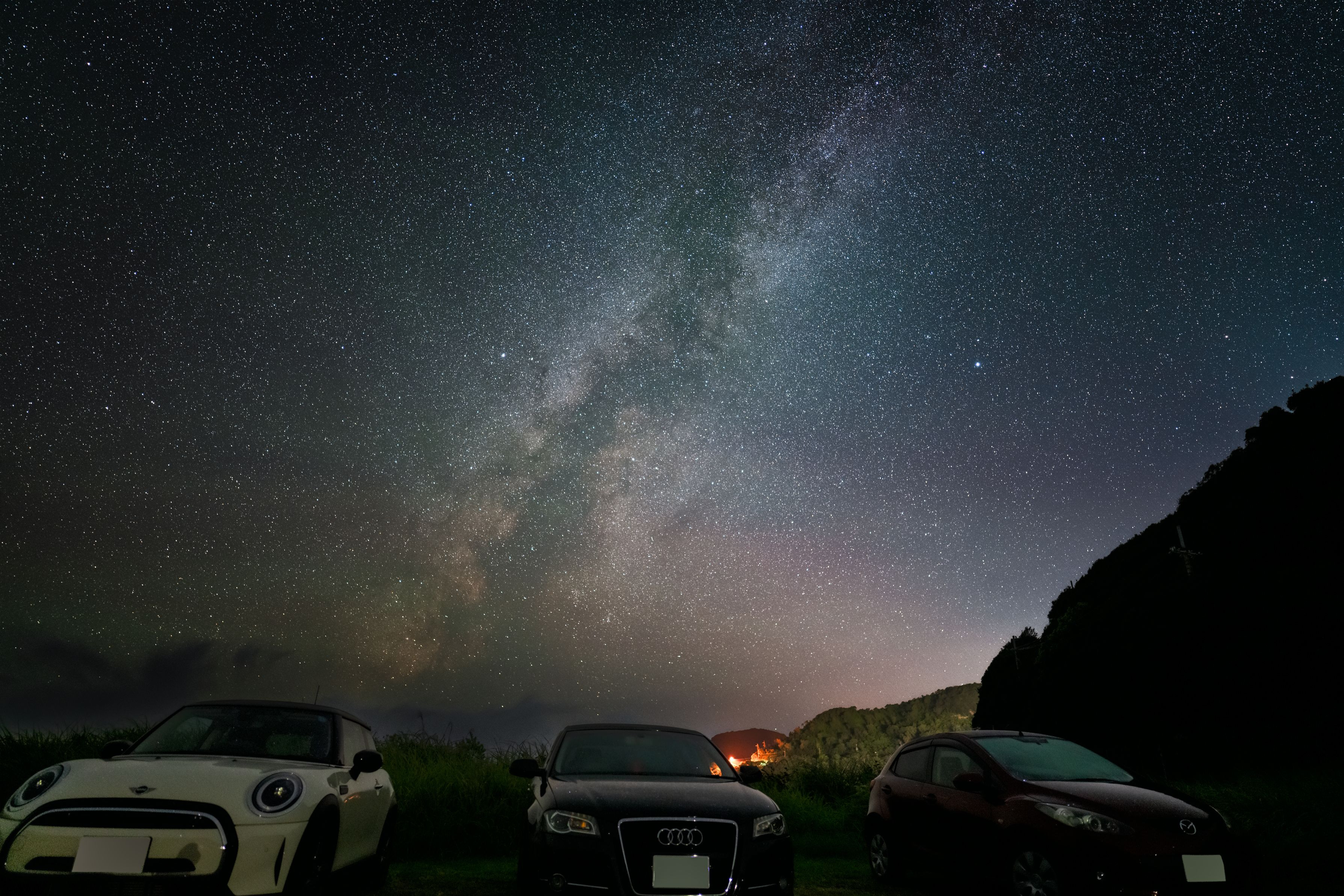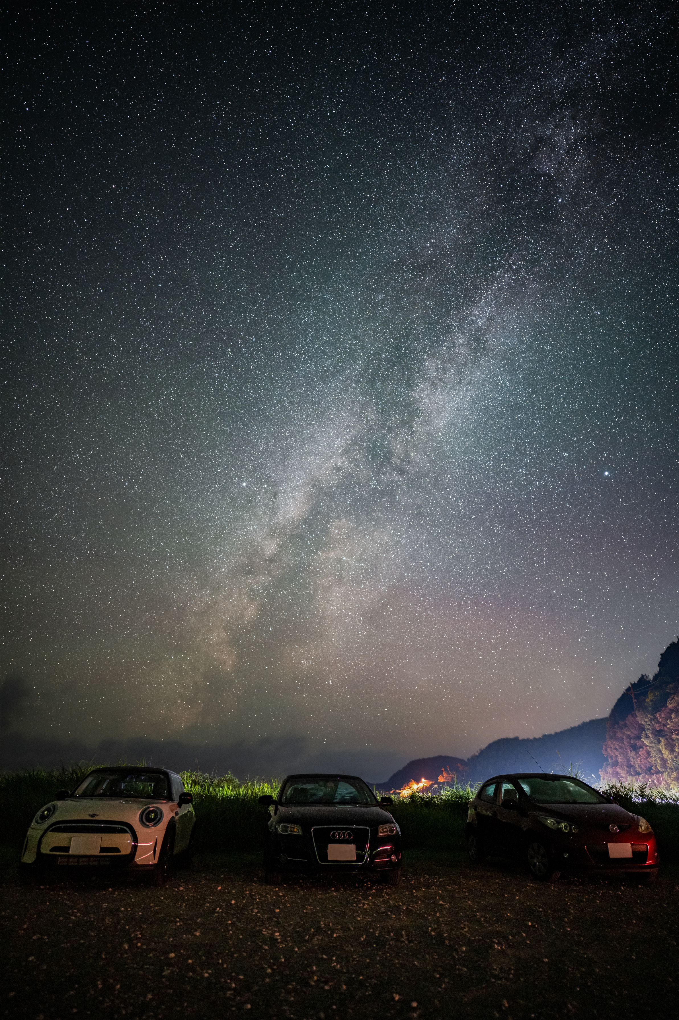 2023年の蔵出し写真。天の川撮影オフ会終了前、tamayaさんdaxさんと私の3人、天の川を背景にそれぞれの愛車を入れて撮影したものです。 2023年も新月期と晴れの日の条件が揃わず、なかなか綺麗な空の天の川が撮れない日が、やっとオフ会で撮影出来たのが良かった思い出があります(^^♪ 午前0時、夏の濃いあたりは沈んでいる時間なのでベガ・アルタイル周辺の天の川です。セクォーター処理。