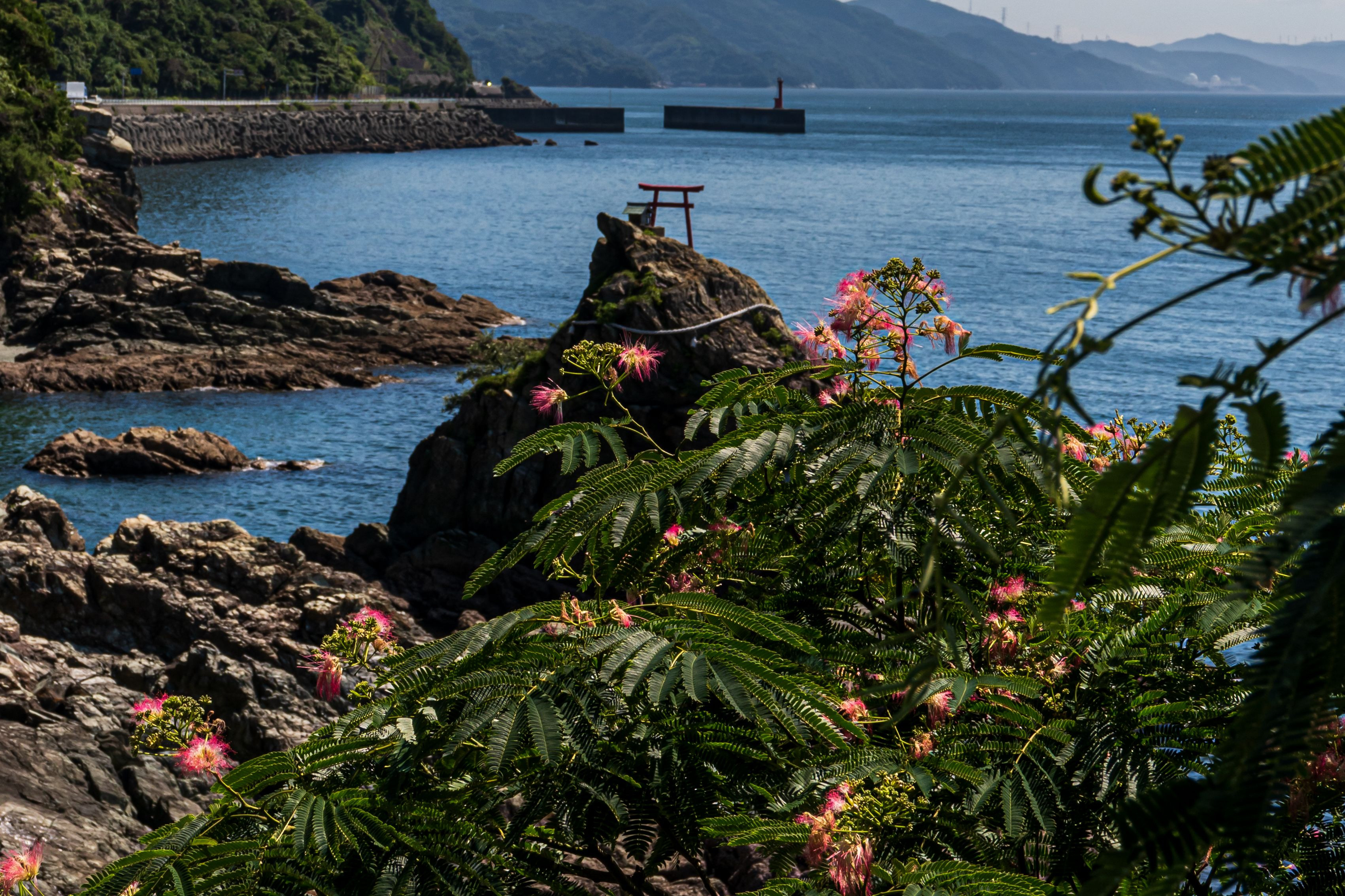 愛媛県大洲市の長浜の綱掛岩を合歓の木越しに撮影しました。