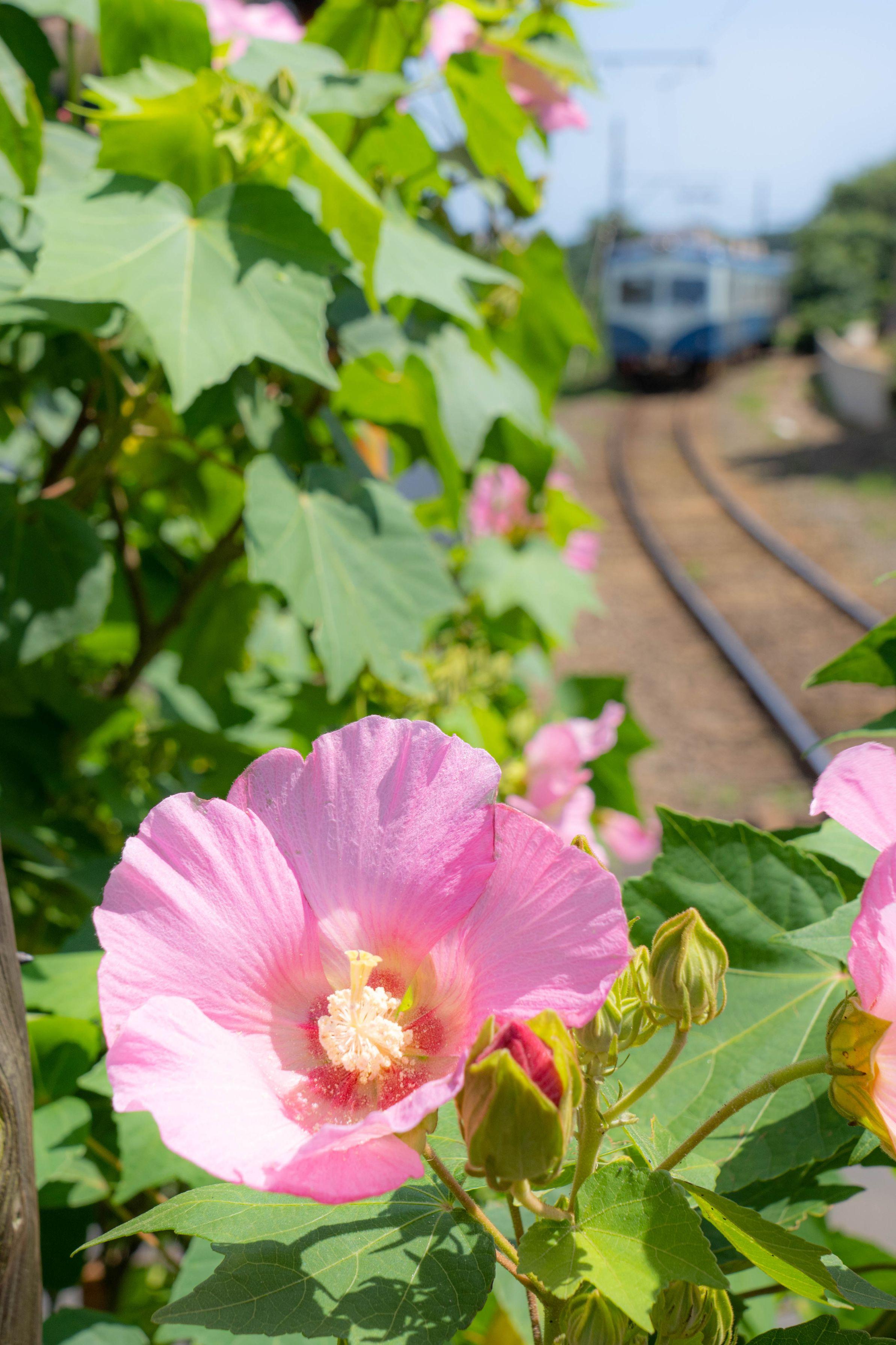銚子電鉄海鹿島駅に咲くフヨウの花。一時の清涼感を感じるとともに、この花が咲くと夏が来たと実感します。