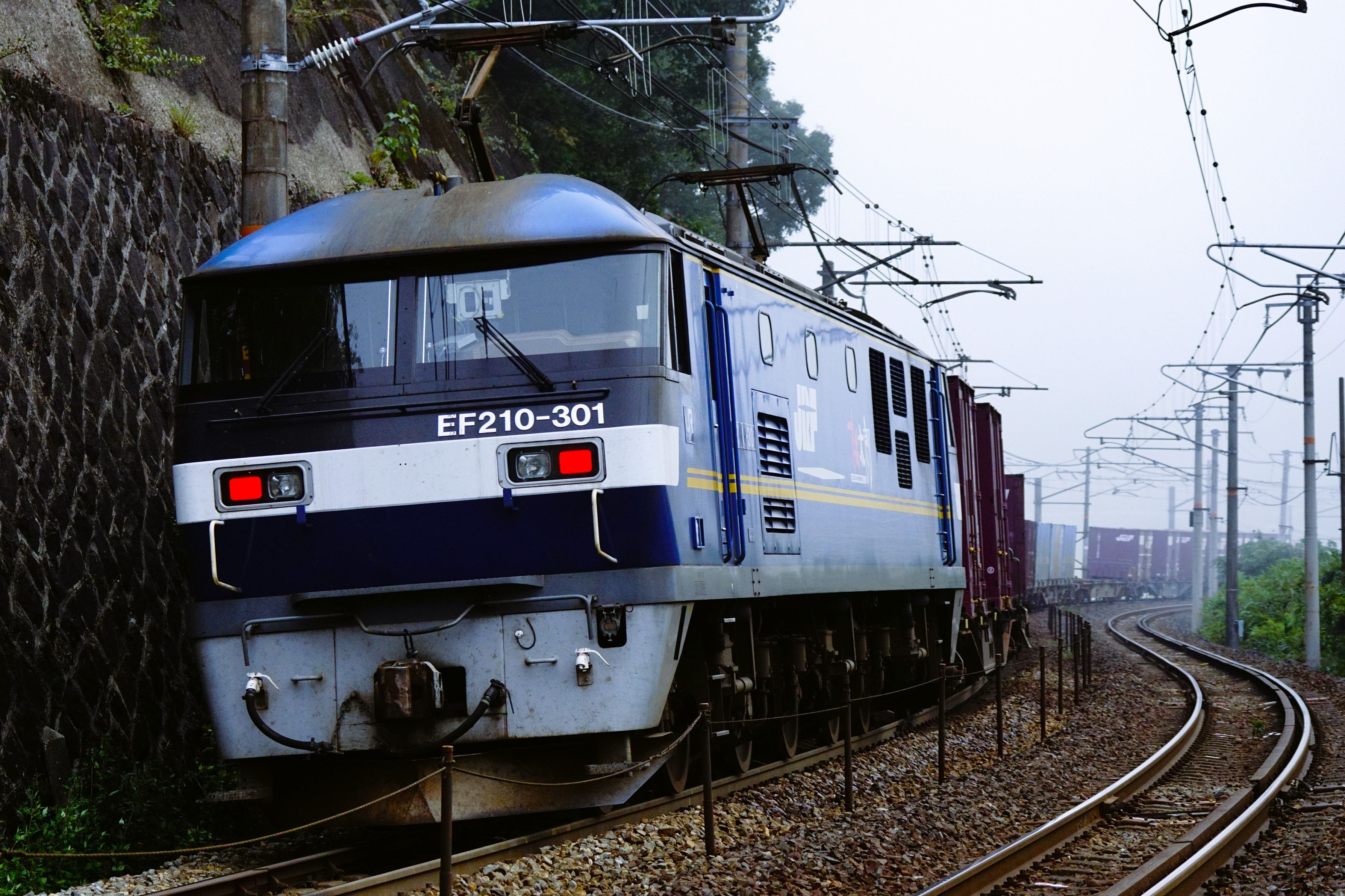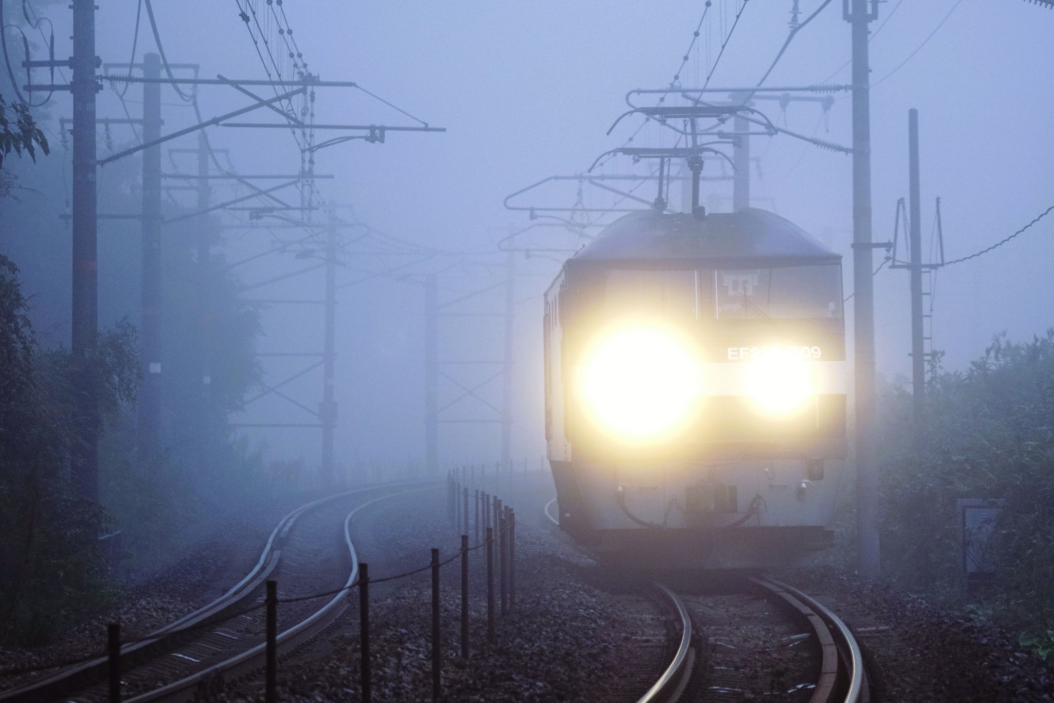 セノハチの峠越えの後補機として活躍するEF210ー309号機が任務を終えて西条から濃霧の中を強烈なハイビームを照らしながら峠を下って来て広島機関区へ帰投する