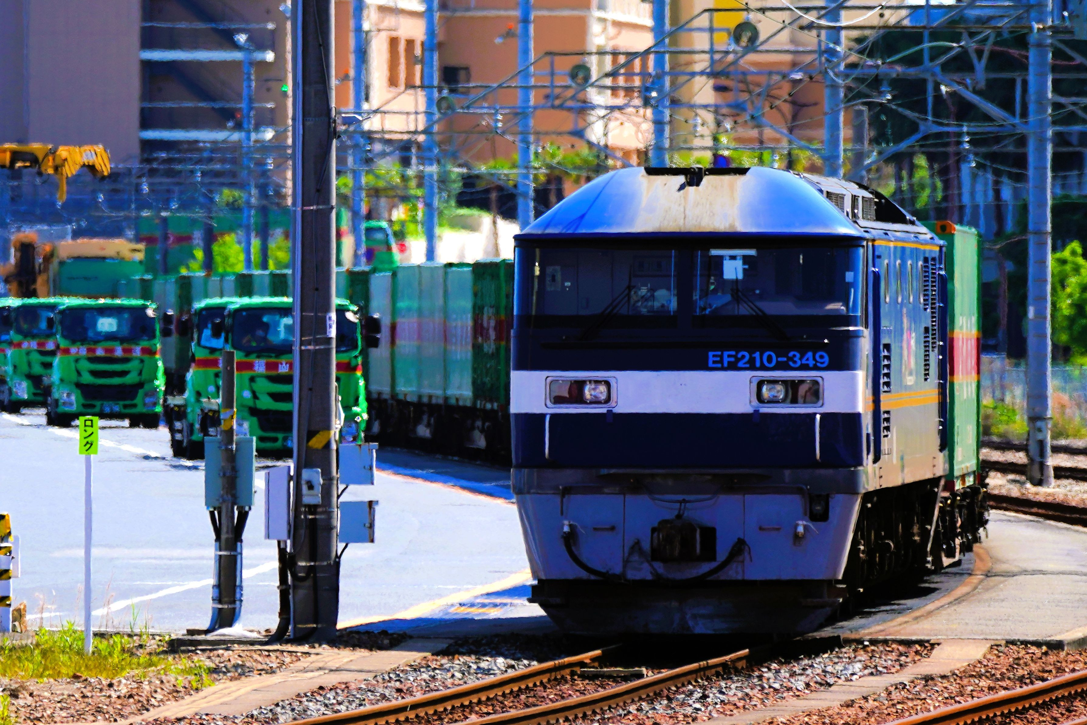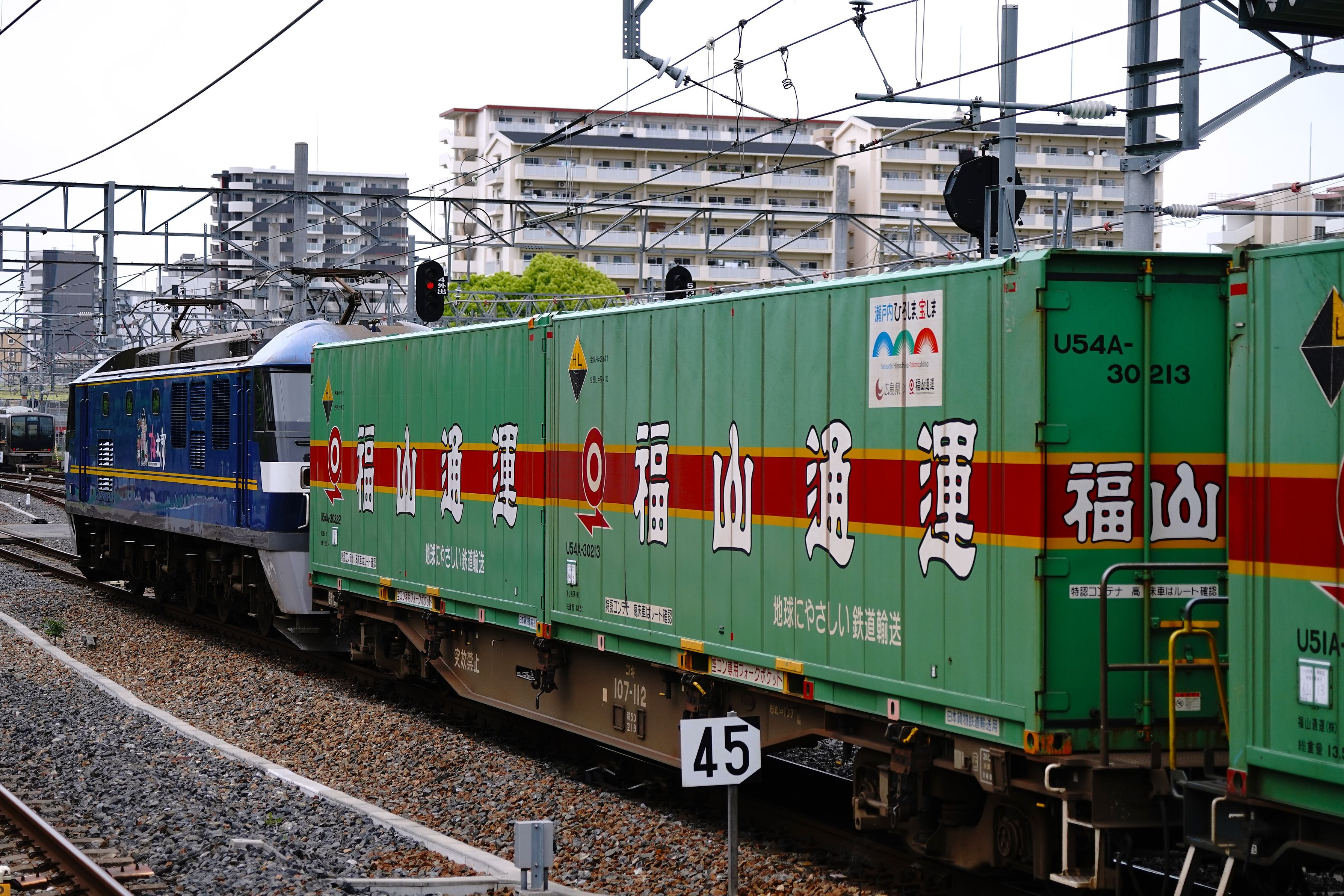 59レ福通レールエキスプレスが到着した安治川口貨物駅でコンテナの降車作業中を連結したまま待期する後補機のEF210-349号機