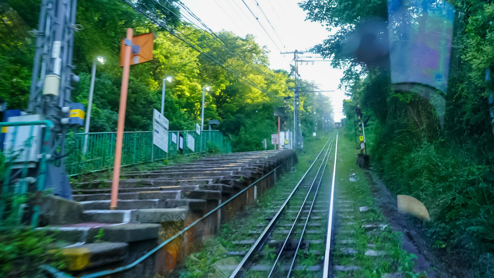 日本最古のケーブルカーである生駒ケーブルカー最後尾席より下って途中駅を通り過ぎて行く様子を撮りました。 窓の反射を活かすかPLフィルターで反射を抑える工夫等色々次回は試したいと思います。
