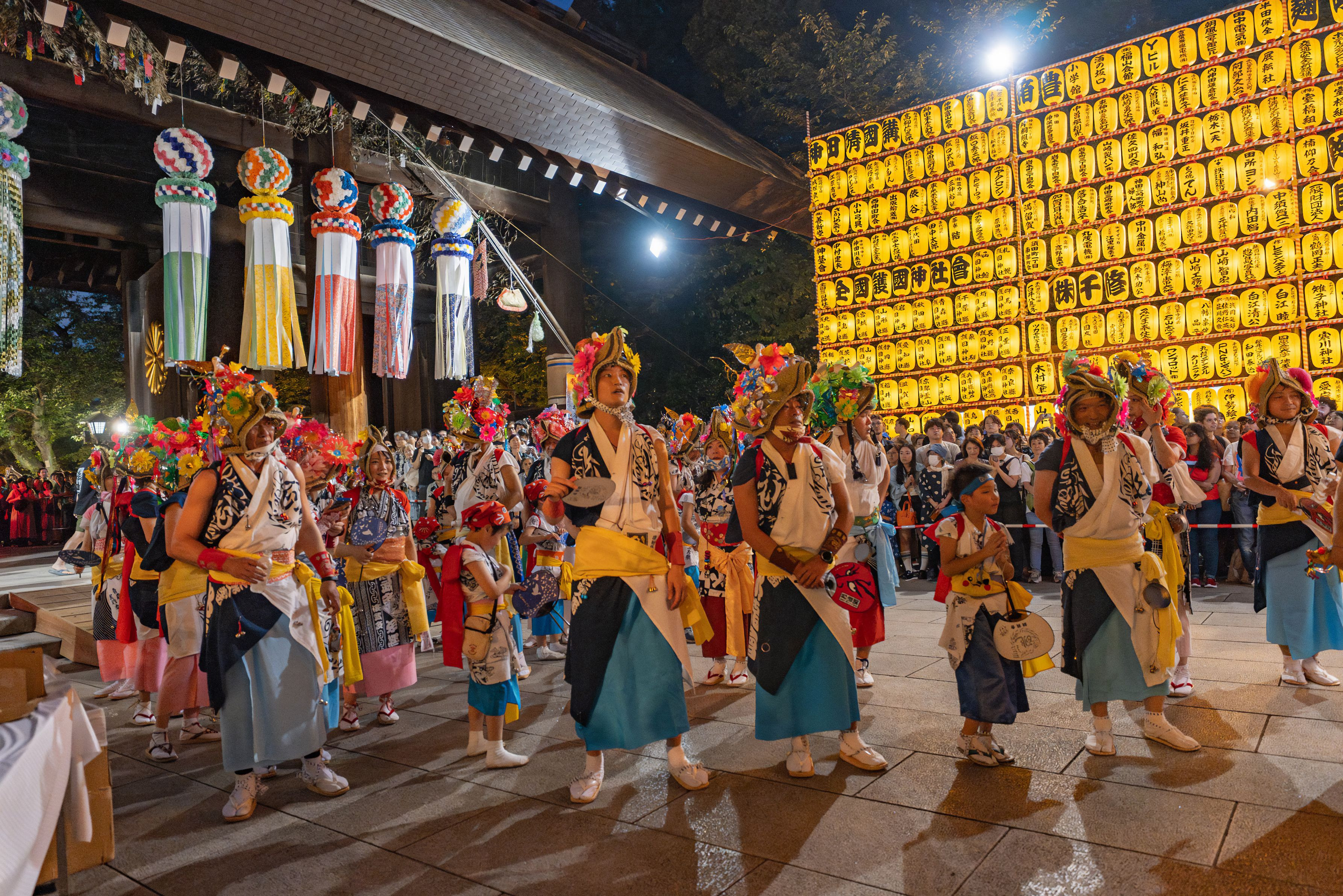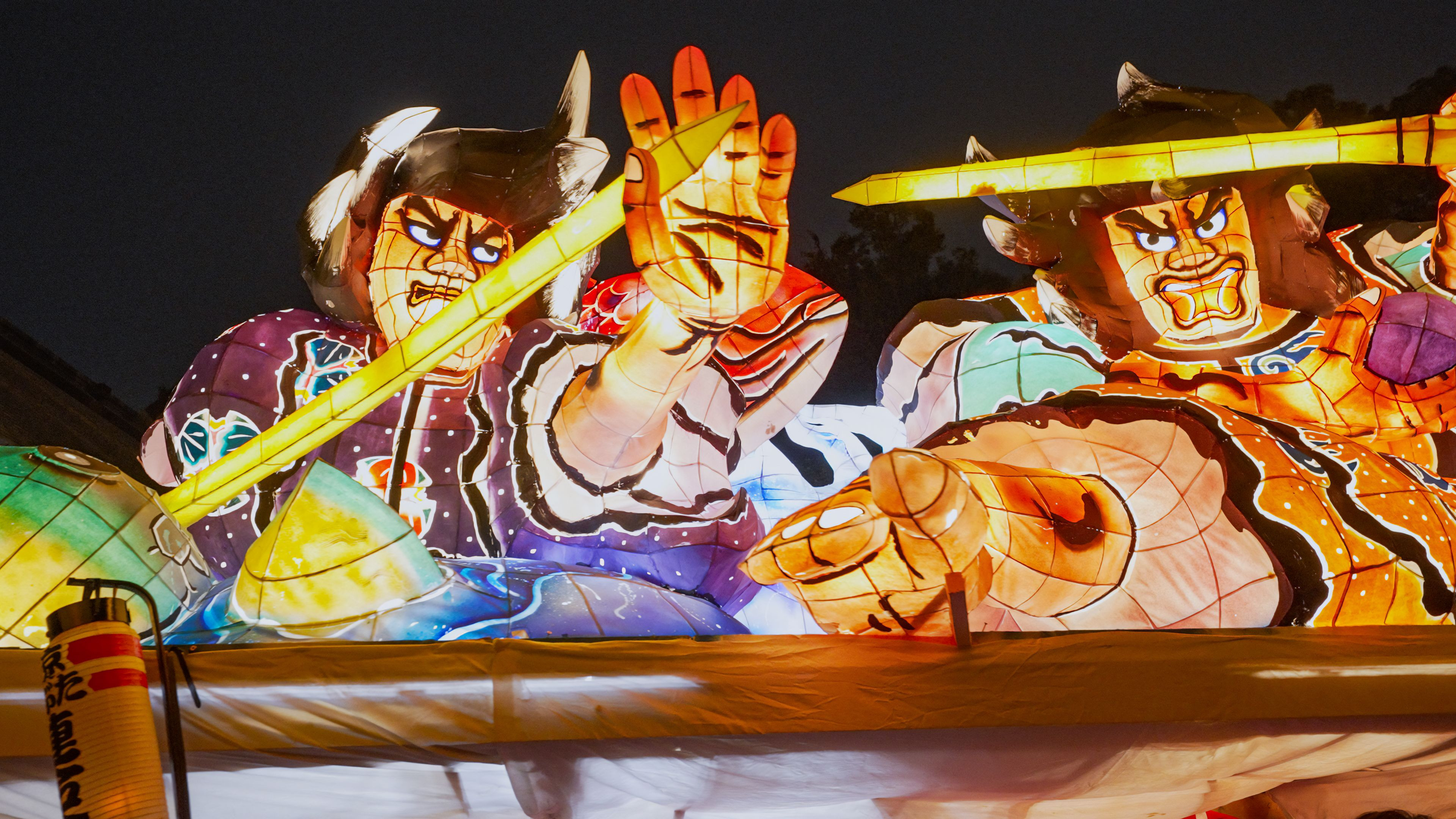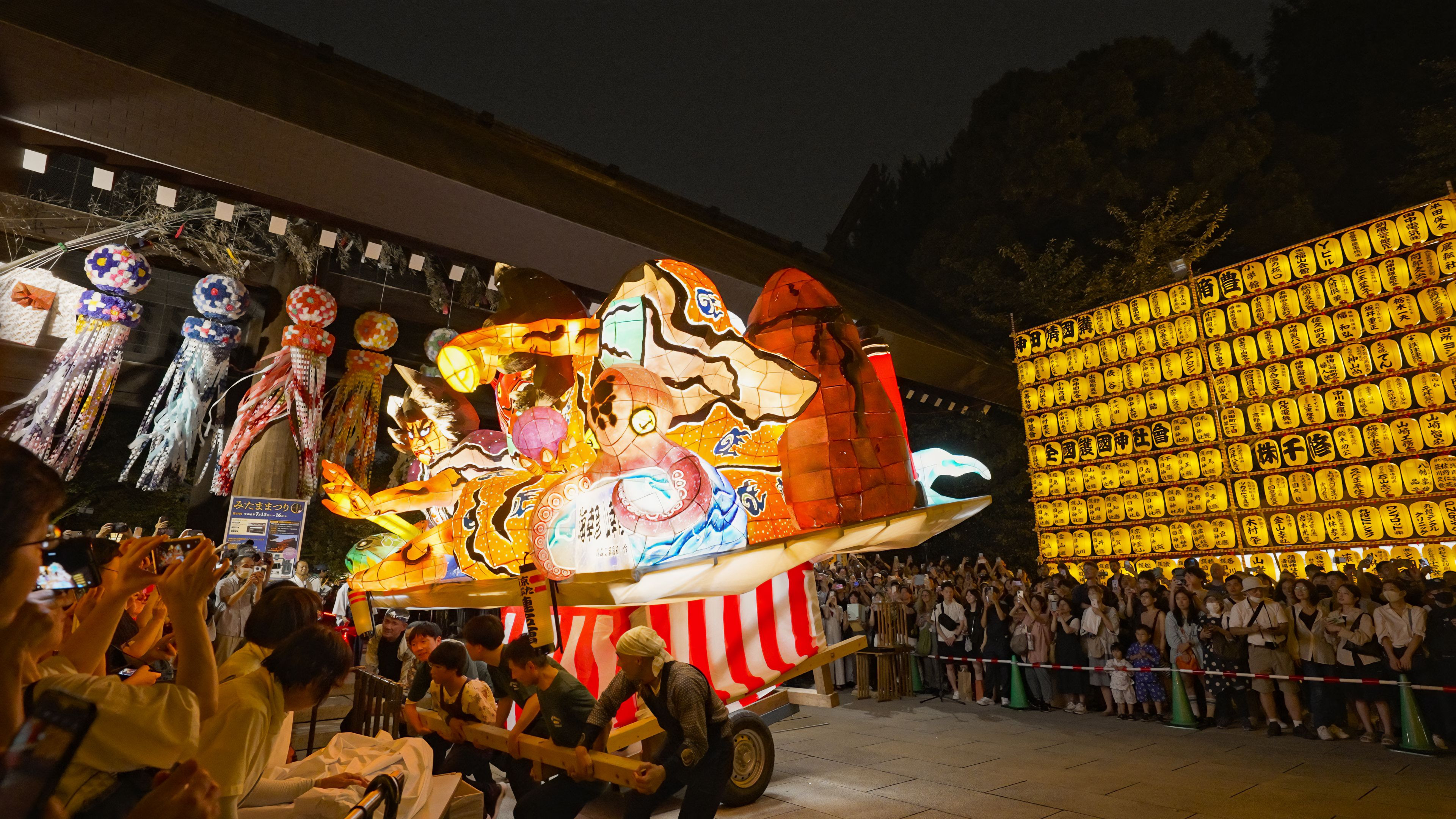 みたま祭りで出される「人形ねぶた」は、特注品で本物と比べ約1/3の大きさだ。それでも、荷車の土台の上に高く作られている(本物は見たことないので知りません)ので「ねぶた」がお辞儀をする時、覆い被さる迫力に圧倒される。リズムに合わせて飛び跳ねる「ハネト」は、楽そうに見えても体力の消耗は激しそう。間近で見たが、跳ねる勢いが違う。自分は無理だ。筋肉がつってしまいそう。