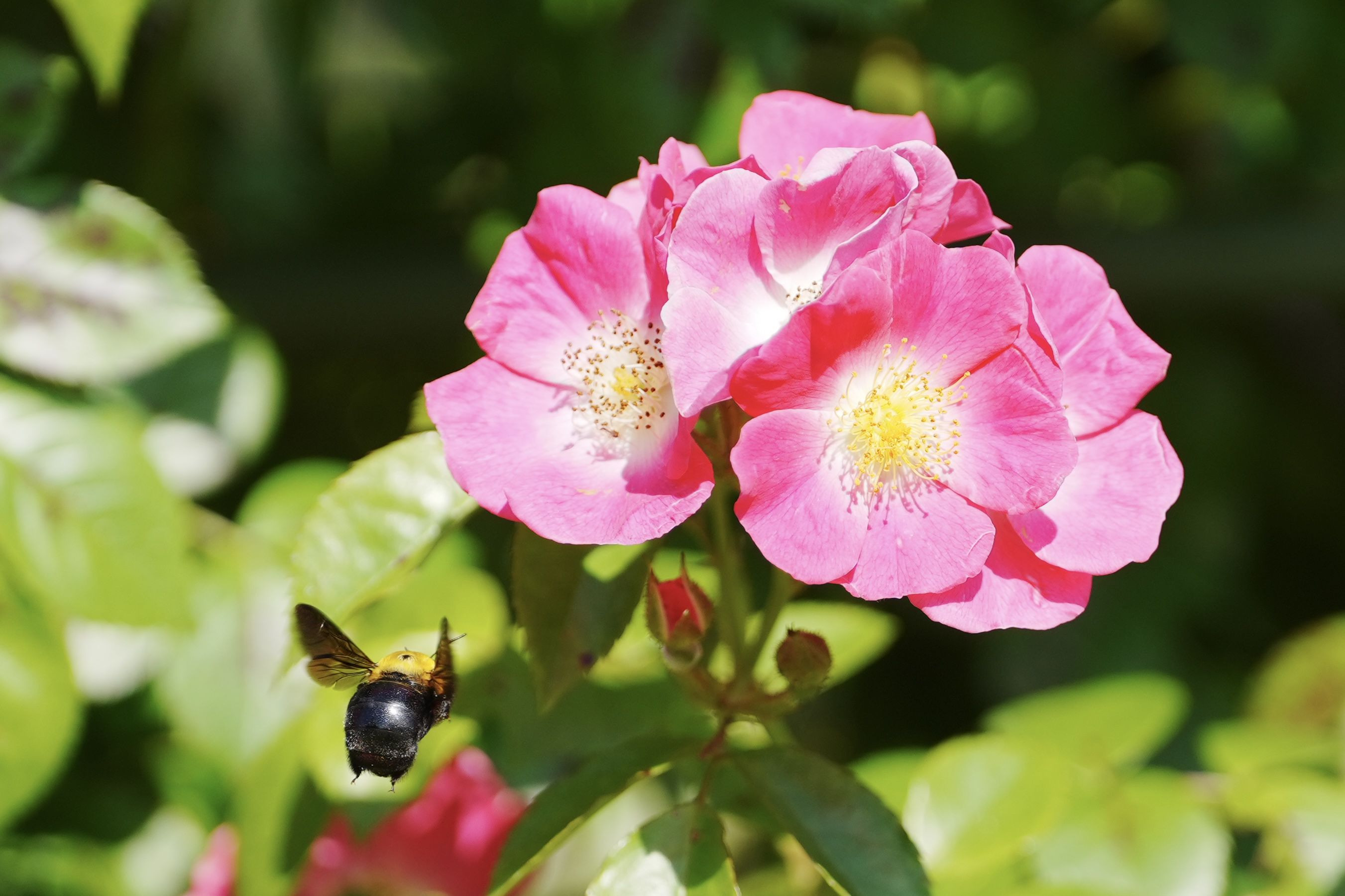 初めてのGM望遠ズームで家族と散歩中に花を撮っていた時の一枚です 1匹の蜂が近づいて来たので一緒に収めようと頑張りましたが、なかなかうまく撮影できませんでした