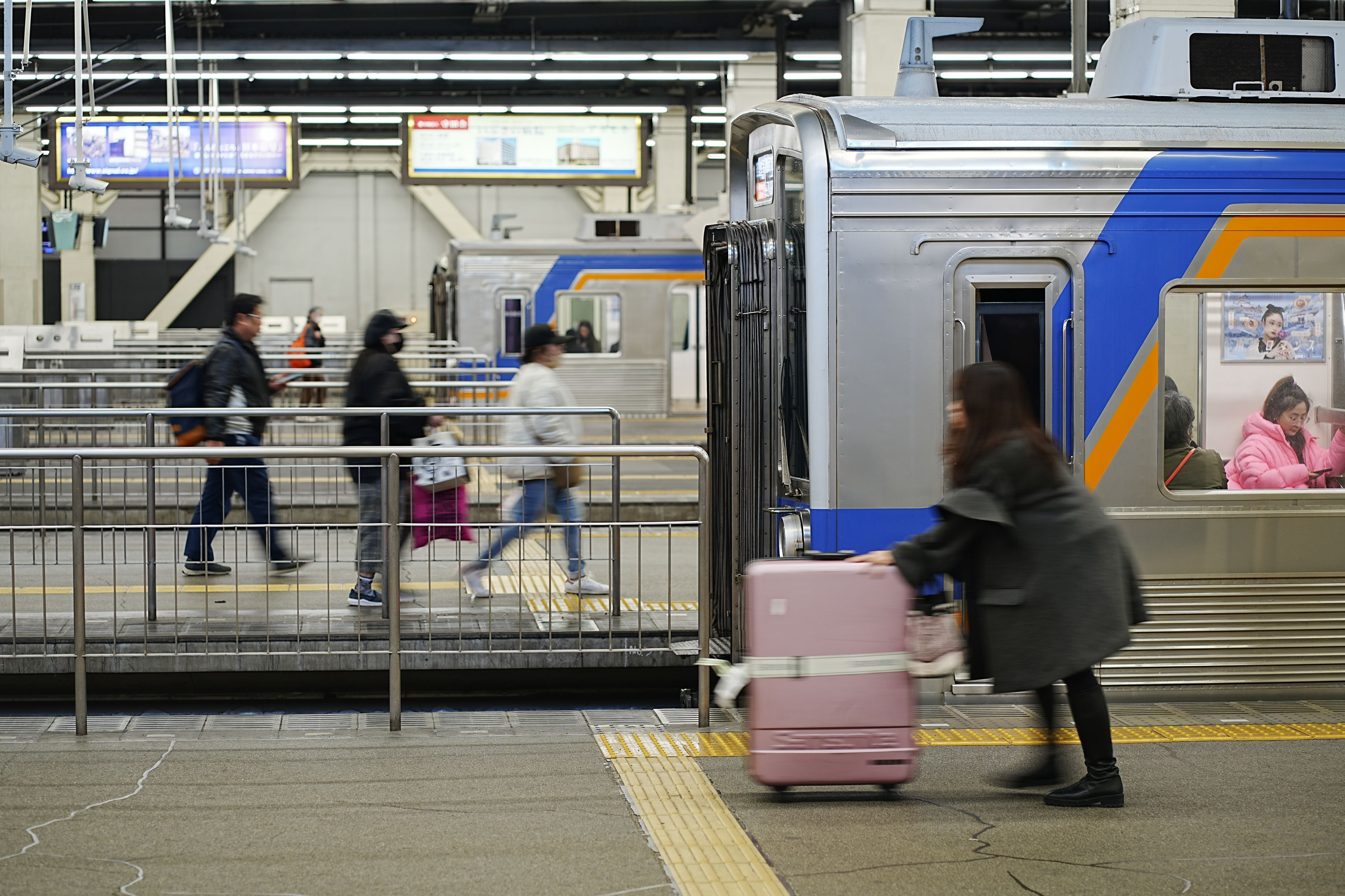 南海の那波駅にて。 電車を利用する人々。 乗る人、降りていく人が交錯する大都会の駅。