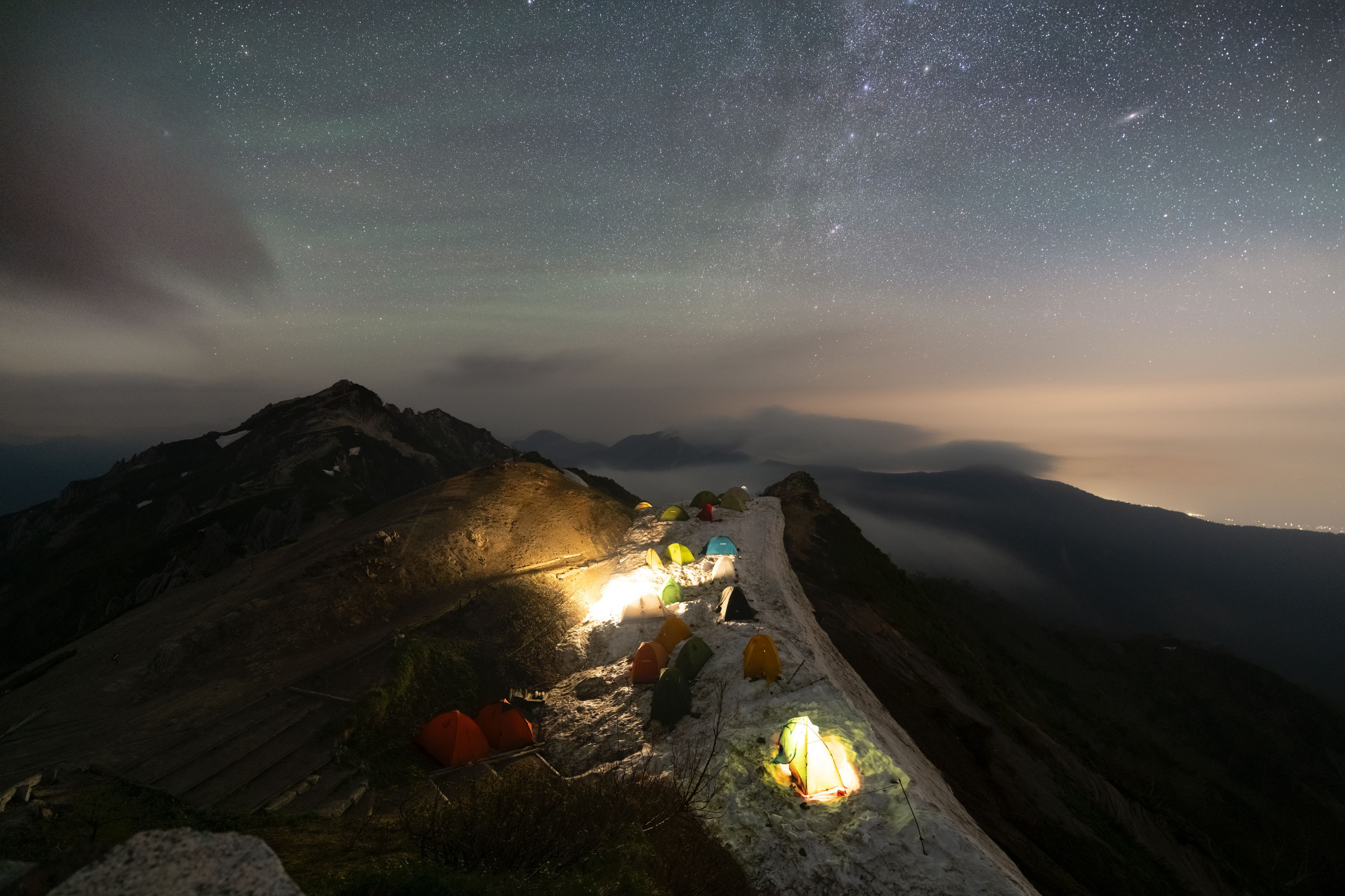 燕山荘から撮影した燕岳と星空です。 テント場の灯りが良い雰囲気でした。