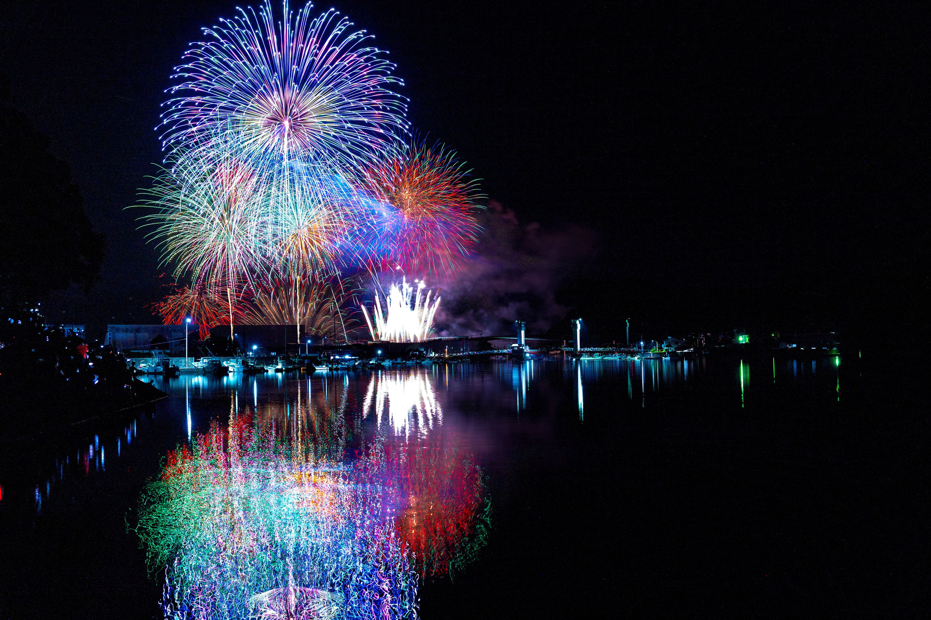 これだけのリフレクションが出る花火は古今東西ここだけでしょう。 大変な人出ですね。