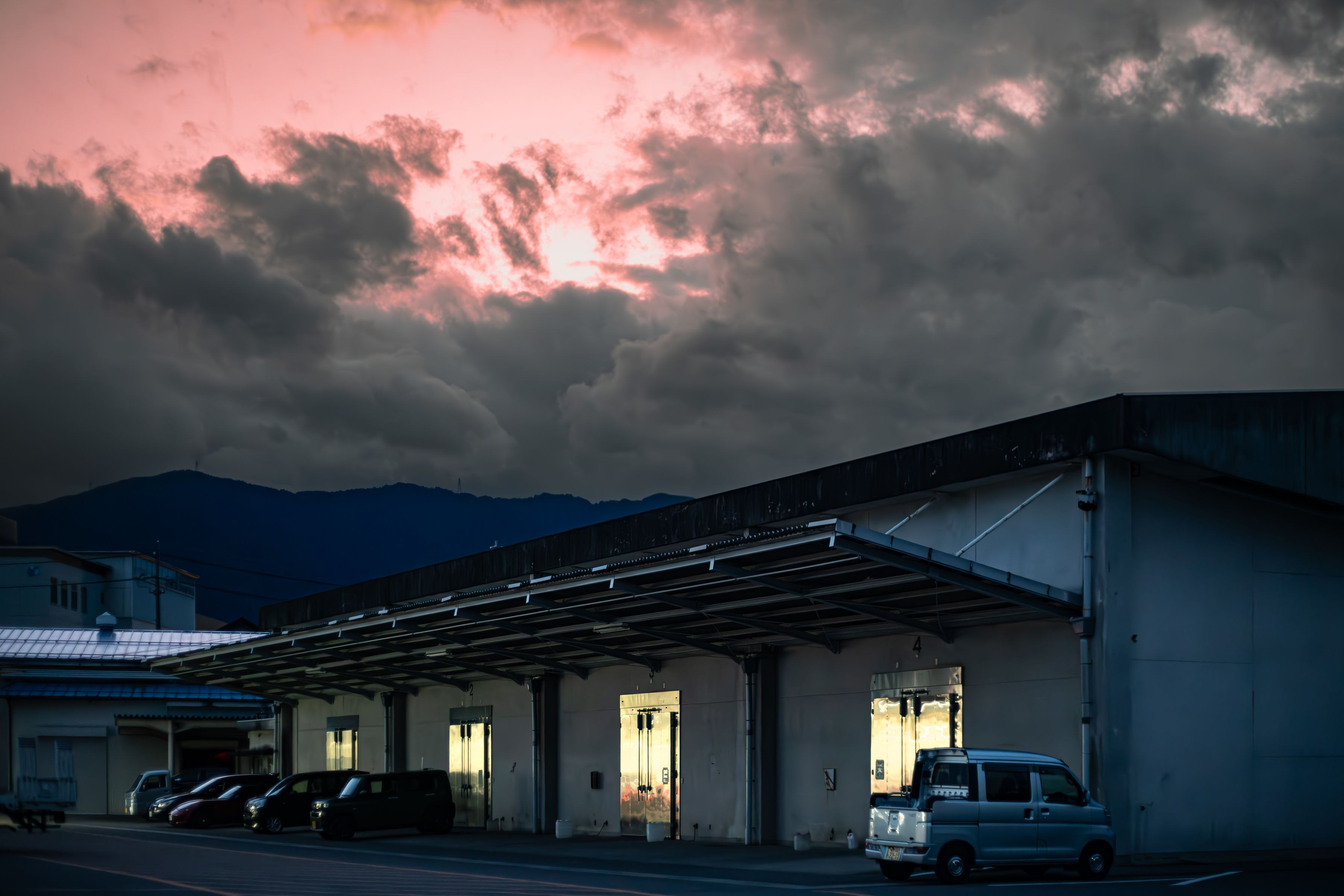 地域にあるJAカーセンター。実は今は使われていない、青果物倉庫もある。その金属扉に車整備のピットの照明やセンターの広告塔の光が反射して輝いていた。空は日没後の夕景の名残が見られた。ノイズ調整・自動補正後、全体をやや暗めにし、空の明度色彩度調整。