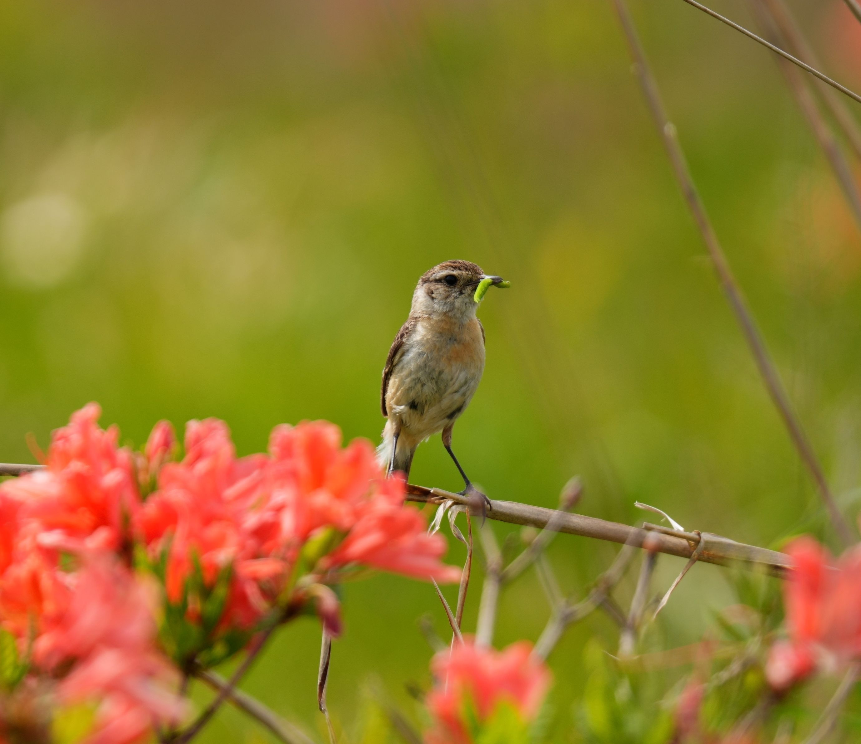 ヤマツツジが咲き乱れる高原を飛び回るノビタキ夫婦。 花に誘われてきた虫たちを、せっせと巣に運んでました。 #ノビタキ#
