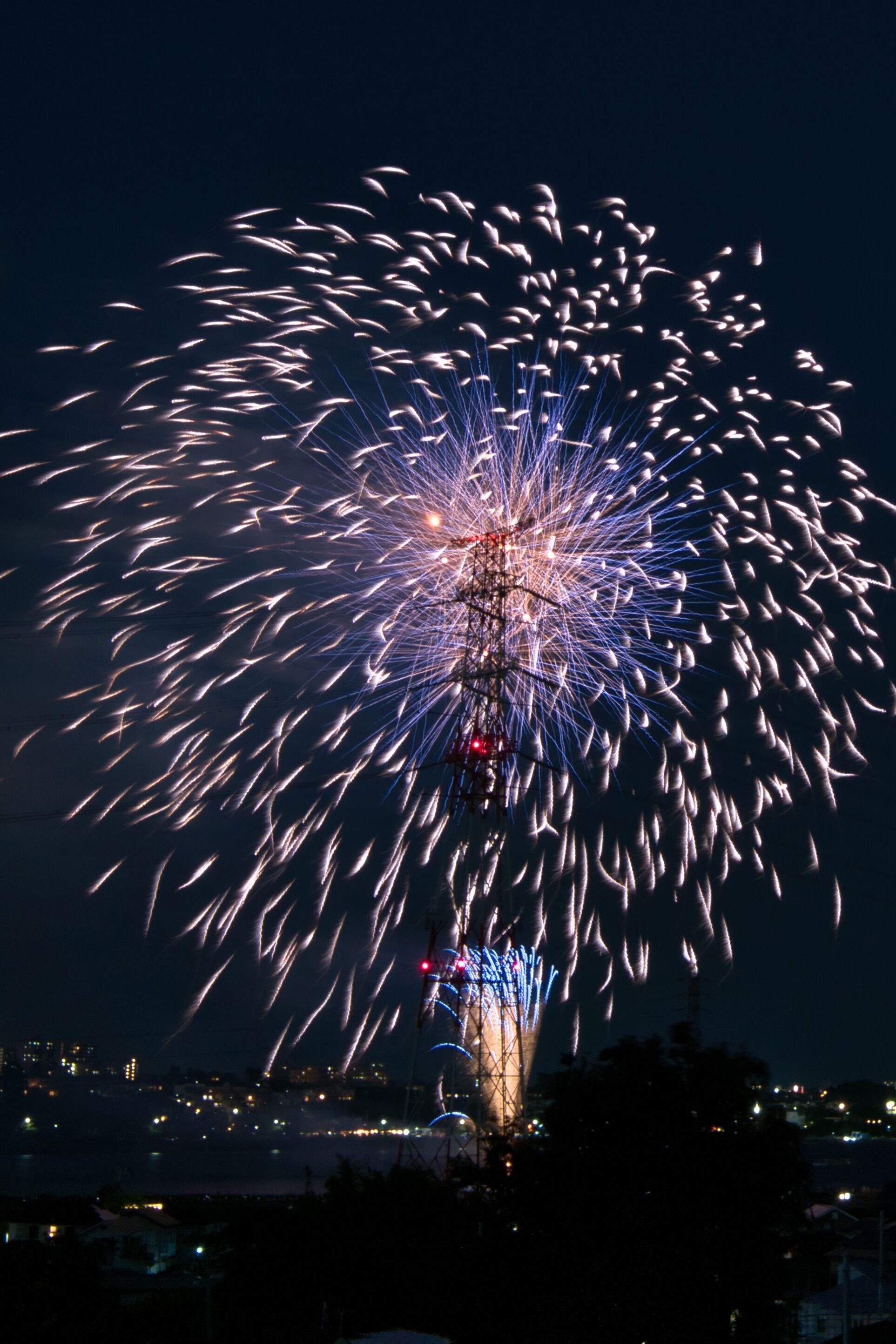 鉄塔と花火が重なった一瞬の一枚です。
