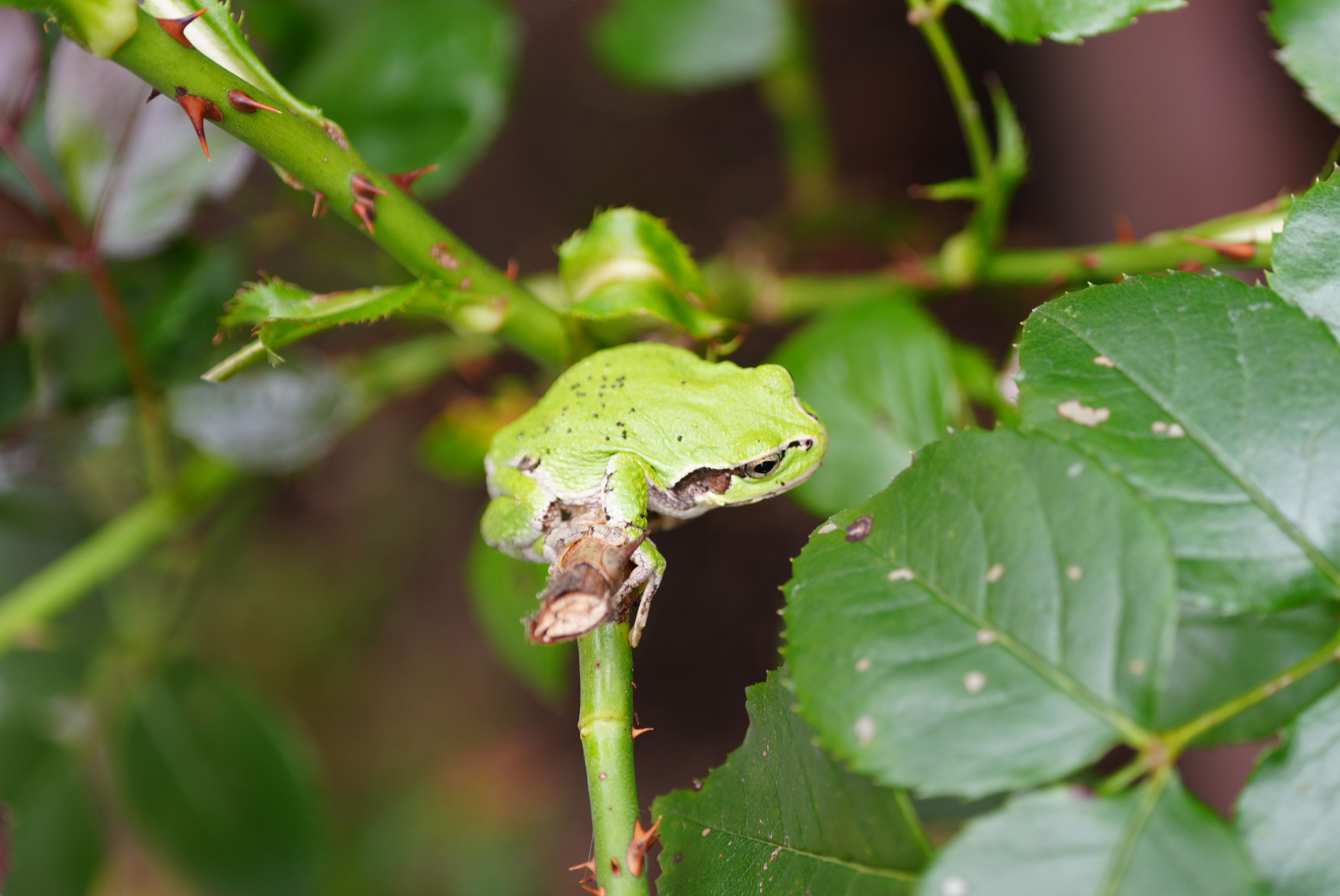 自宅でつる薔薇を剪定中、枝に来訪者を見つけました。私の地区では珍しかったので、シャッターを切りました。カメラを向けても一切、動じずに堂々としている姿が印象的でした。