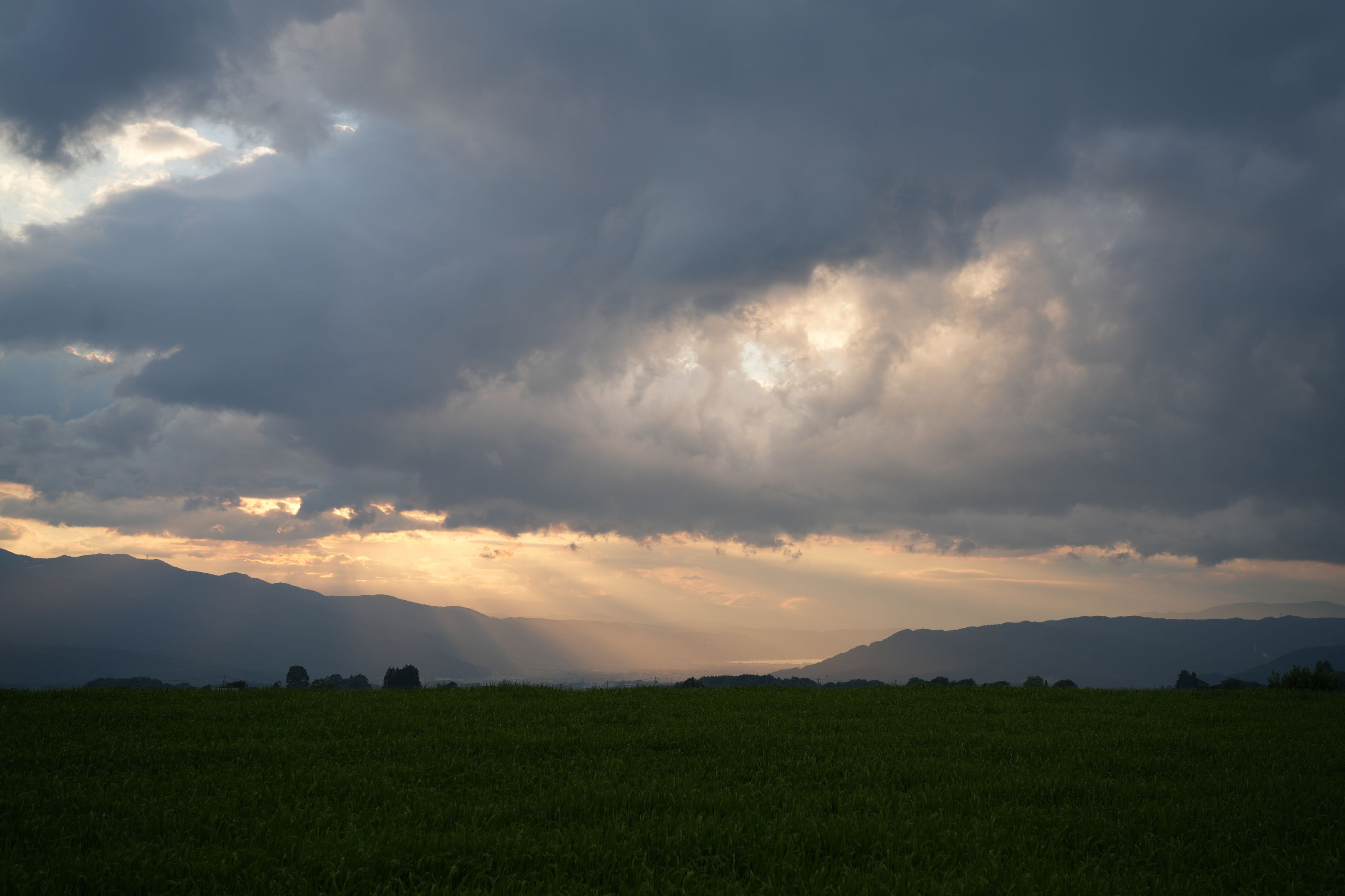 セイジオザワ松本フェスティバルの帰り道、上空を夏雲が覆って車を降りて観察。諏訪湖に天使の梯子が舞い降り時間が浄化されたようでした。