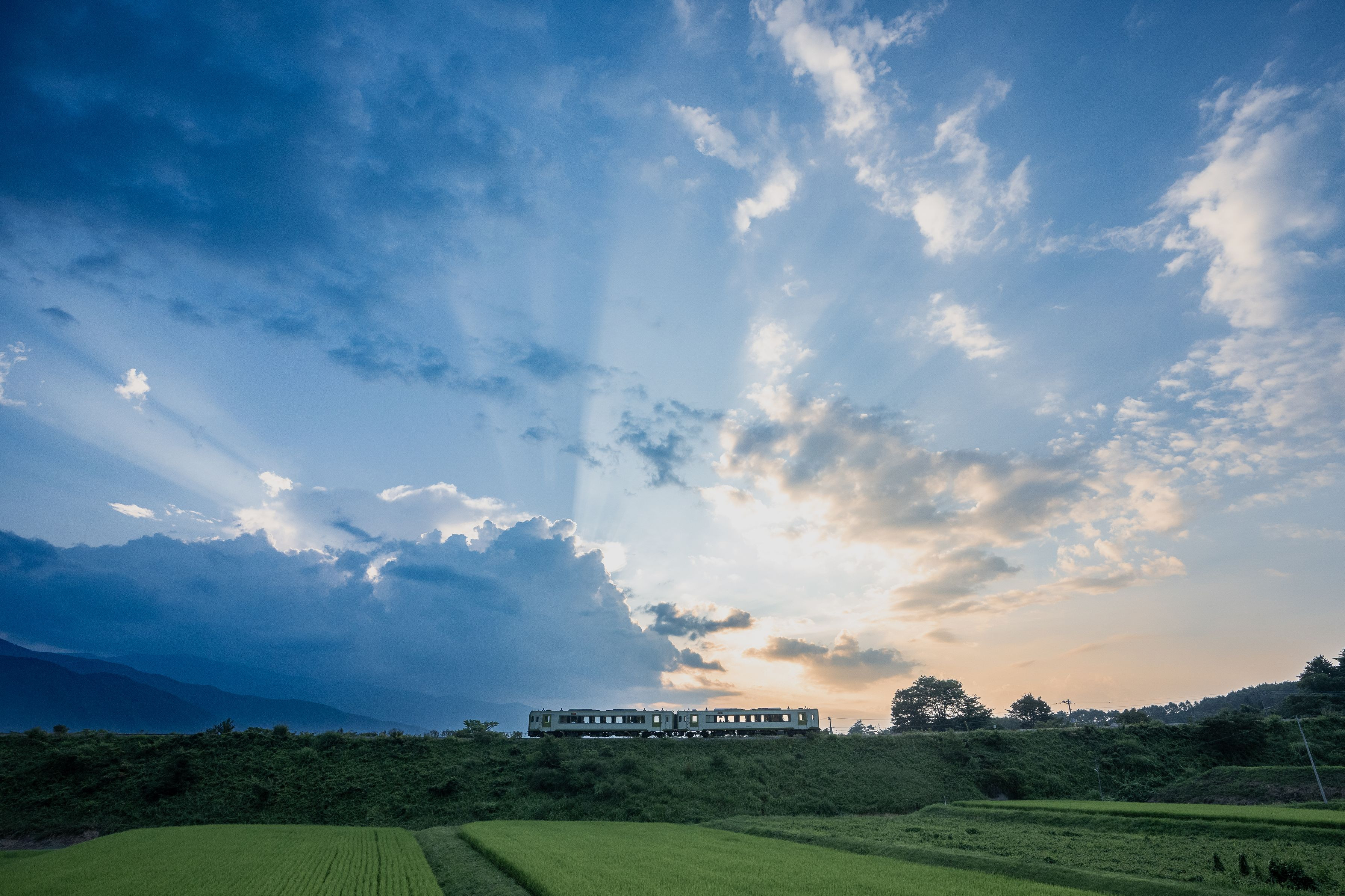 車体の窓と空の光芒に家族で見とれた夕方の一時です。 #山梨県# 山梨県小淵沢の小海線大曲のカーブにて