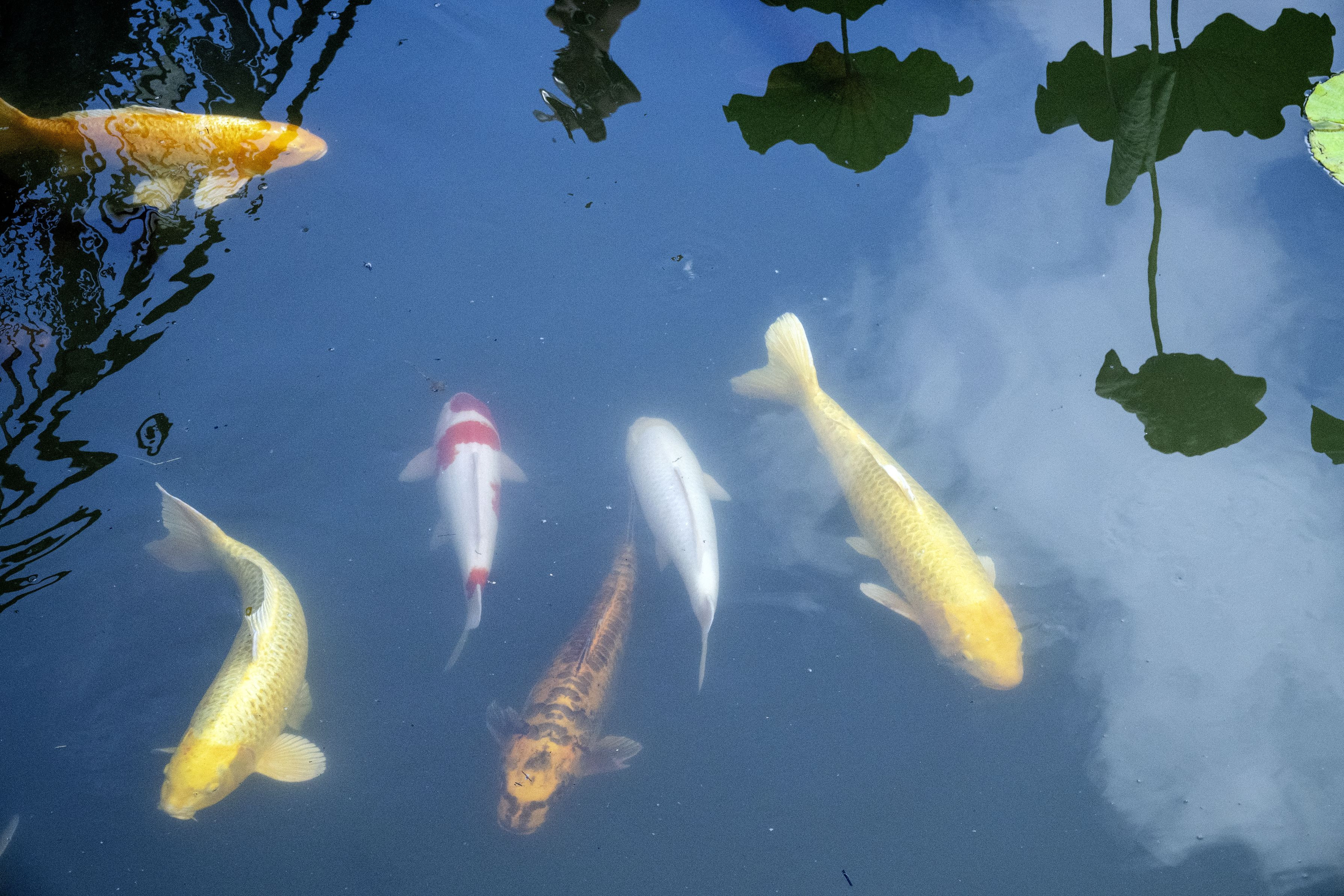 夏空が写った池を、ゆらりとおよぐ鯉達。蓮の花がすずしげな朝の風景でした。