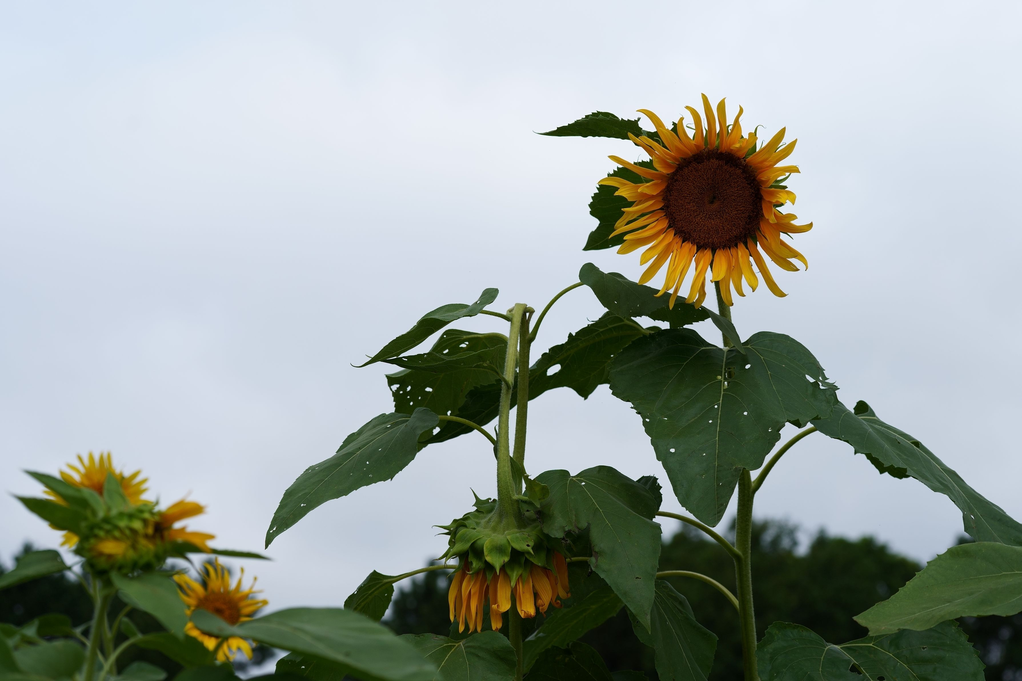 台風一過のひまわり畑。 傷ついた仲間を抱きかかえようとするような、ひまわりの姿を見かけた。 胸がちくりとした。