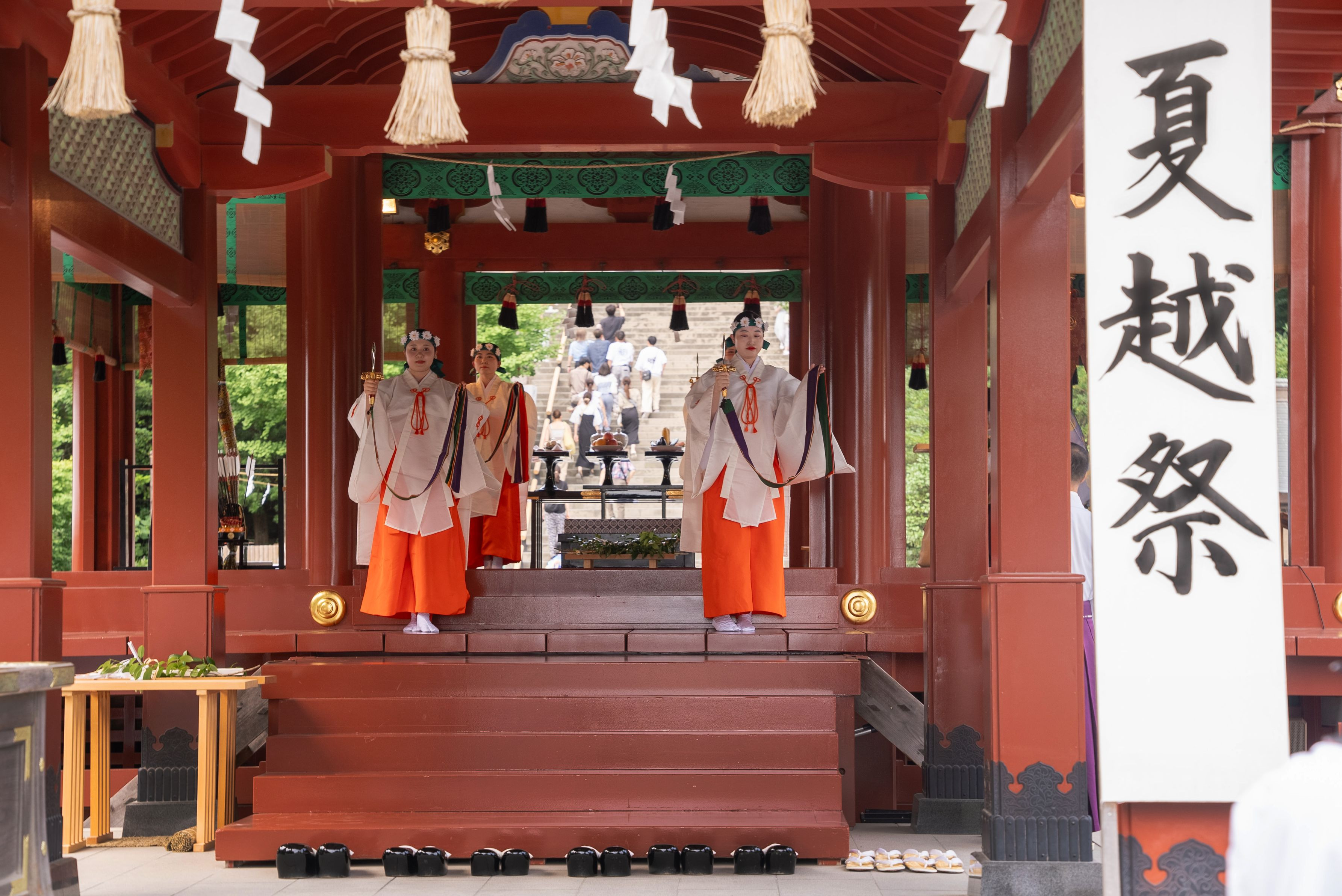 舞殿での祝詞奏上、そして4人の巫女による夏越の舞が奉納された。
