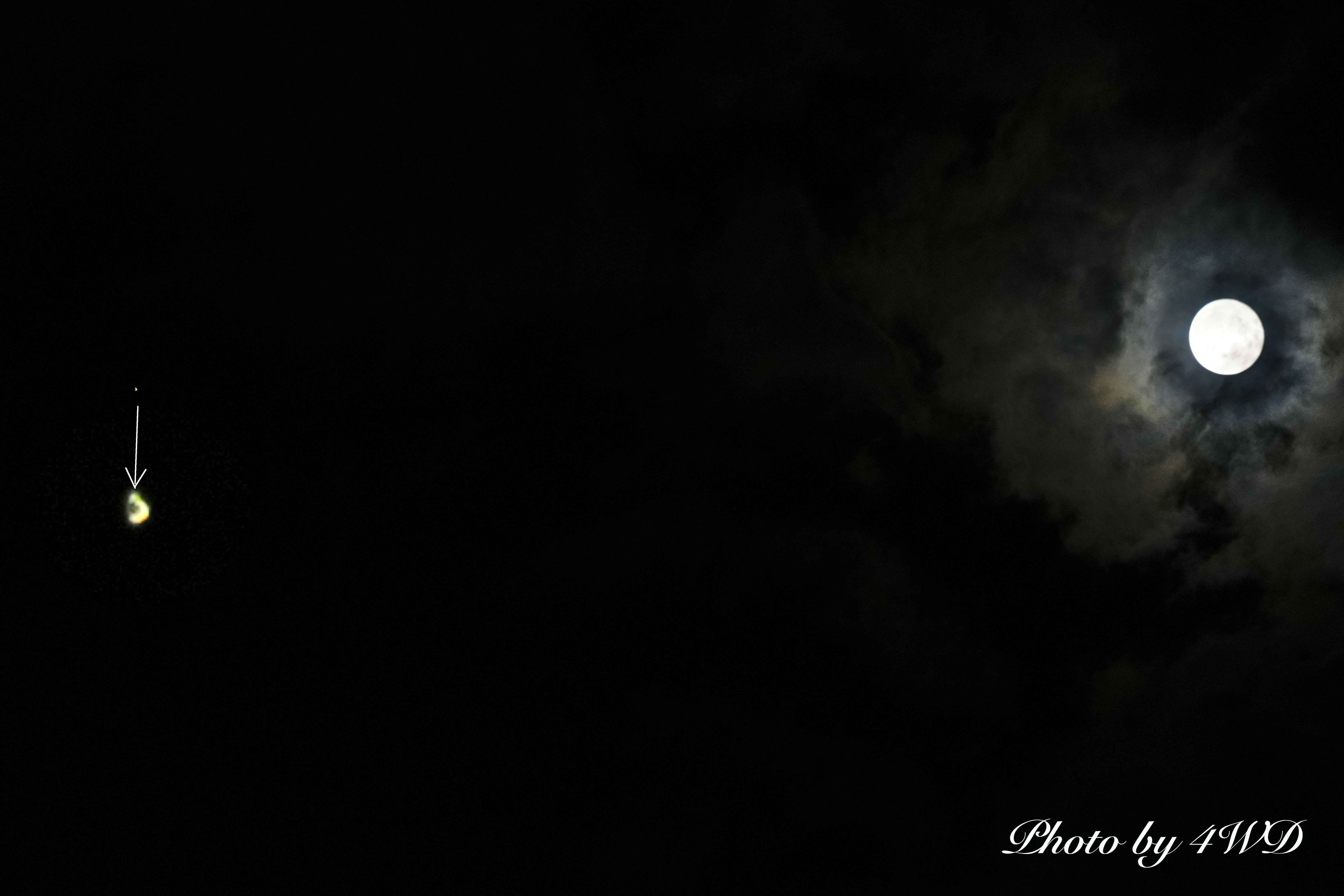 画面左側にとても小さいですが土星が写っています。 土星の下に10倍に拡大して貼り付けました。 200mm望遠レンズの画角に収まりました。 月が明る過ぎるため雲に少し隠れるのを待ち、手持ちでマニュアル露出撮影です。