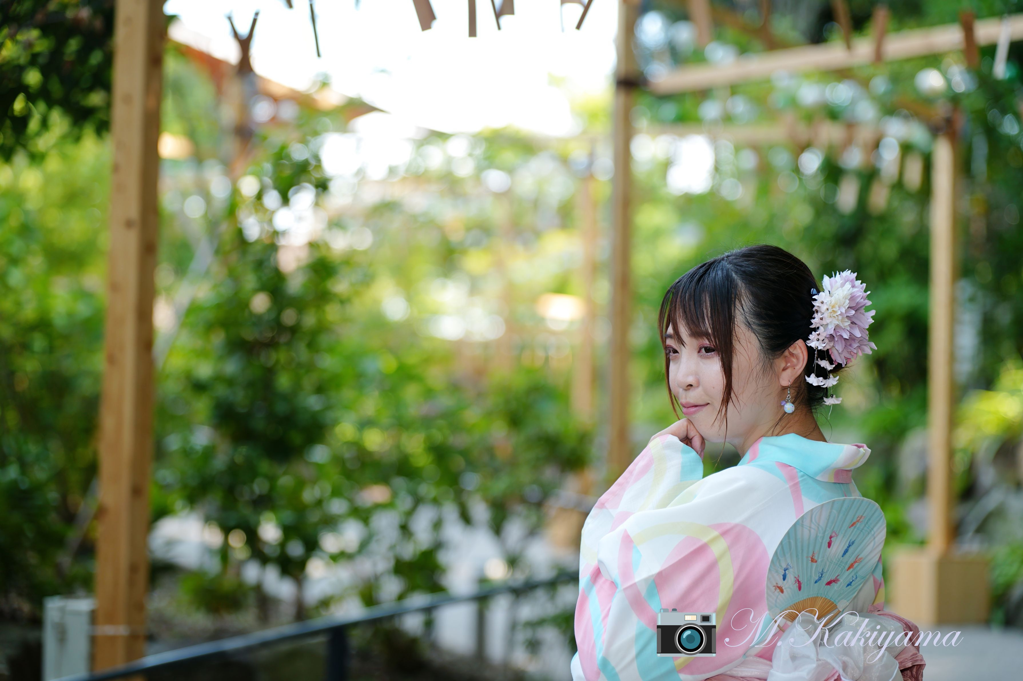 風鈴が飾り付けてある神社にて撮影しました。日陰だったので夕涼みの情景を撮影しました。