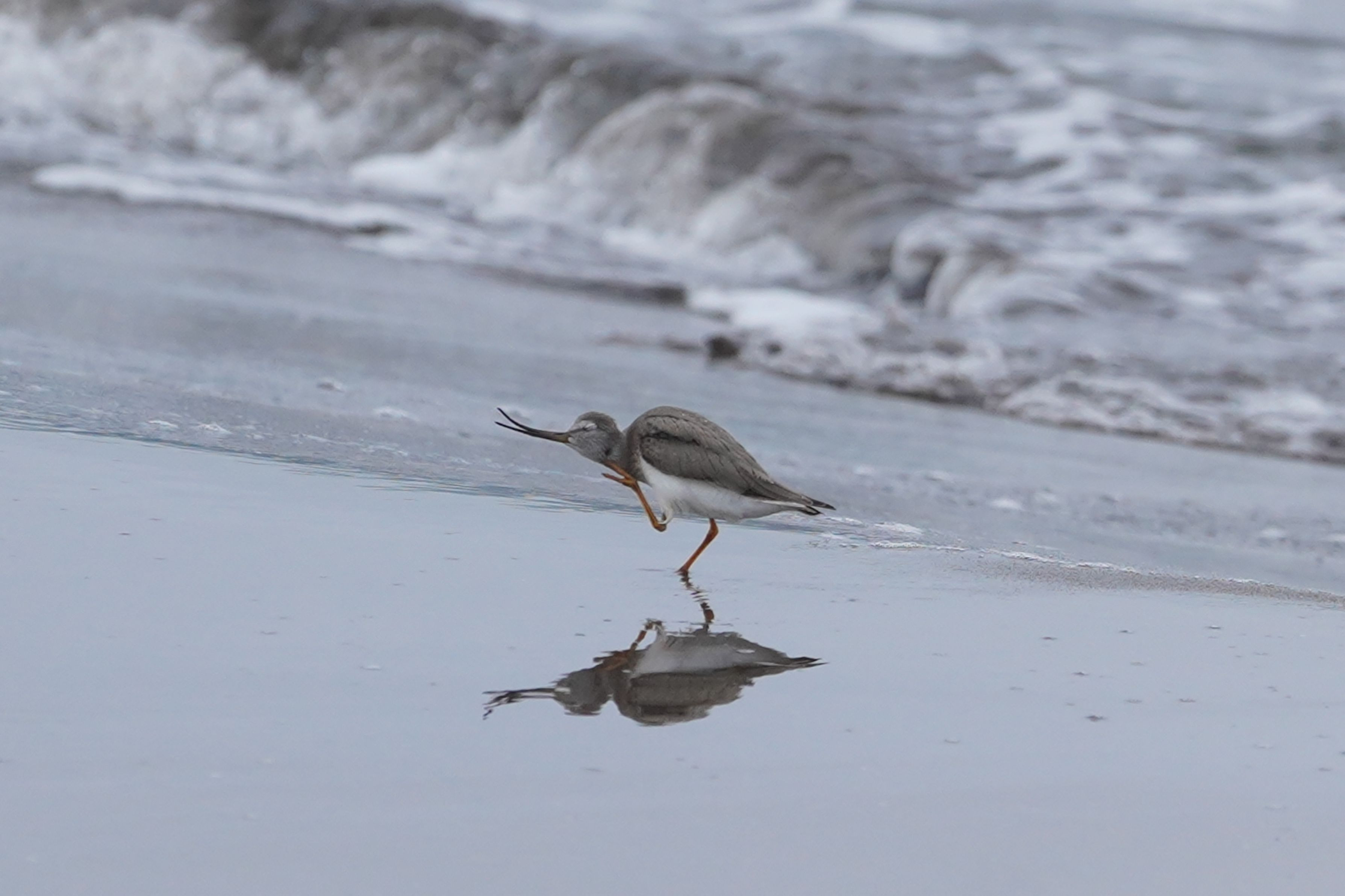 河口から海岸沿いを歩いていると1羽のソリハシシギが現れました。