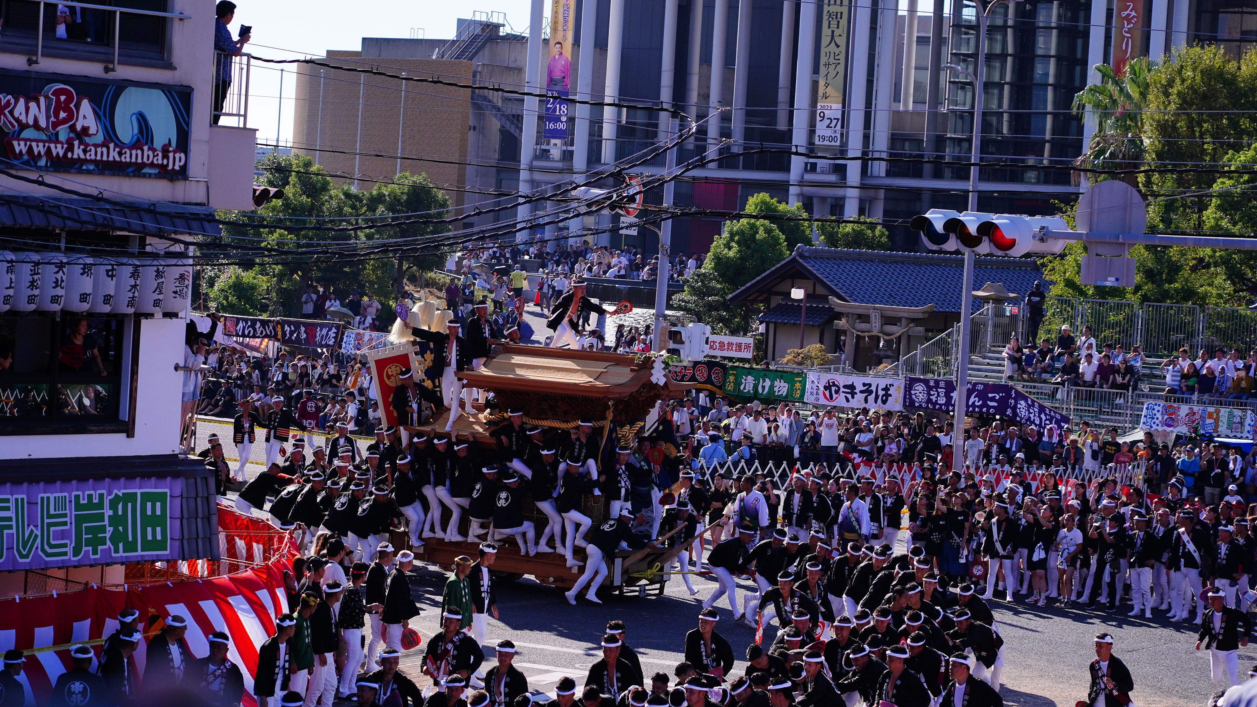 岸和田だんじり祭の見せ場、直角に曲がる、「曳き廻し」の瞬間!