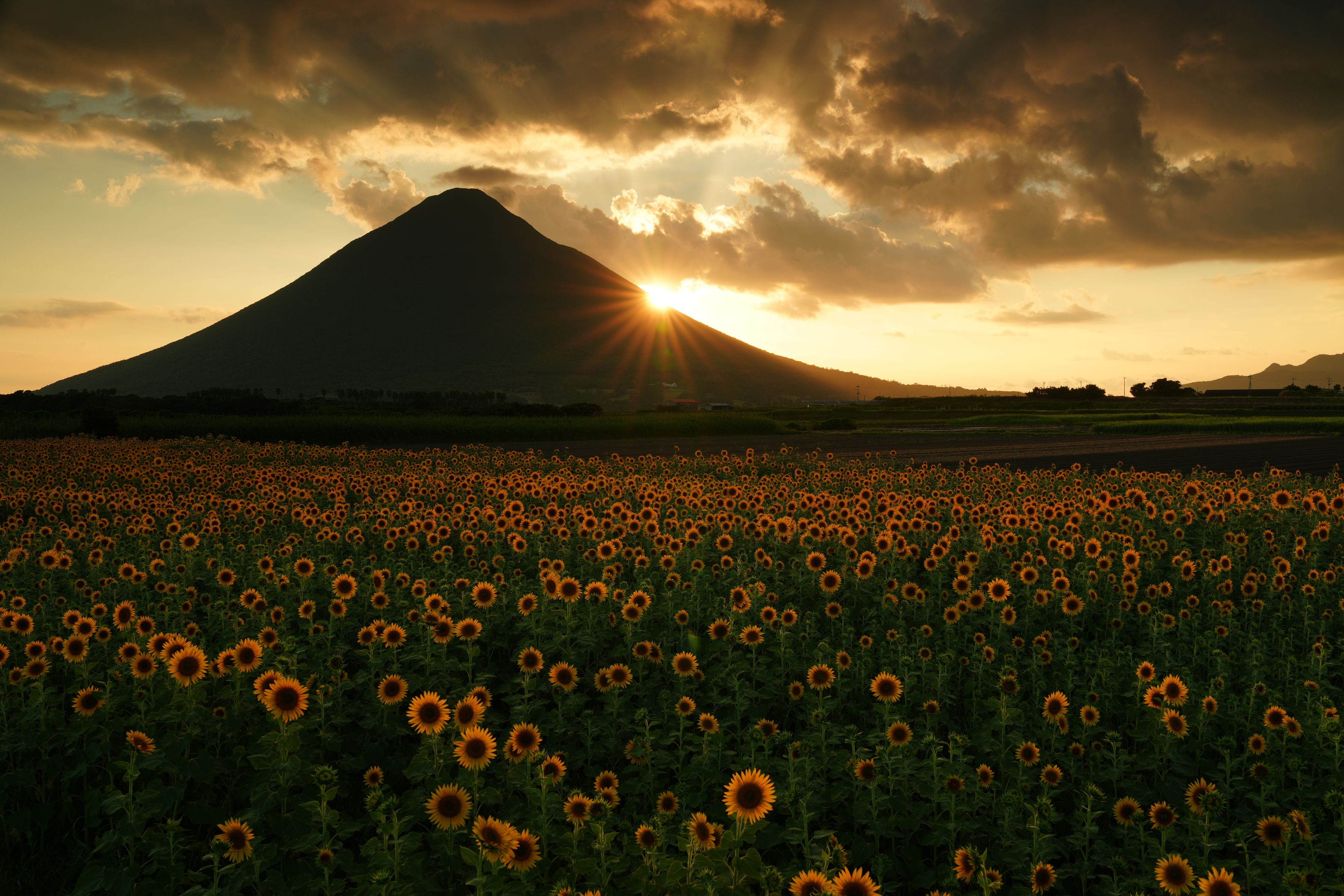 鹿児島県指宿市の開聞岳を撮影しました。 ひまわり🌻がいい感じに咲いていました。 ※三脚.レリーズを使用。 ※可変ND.ハーフNDを重ねて撮影。 ※ホワイトバランスを調整して撮影。