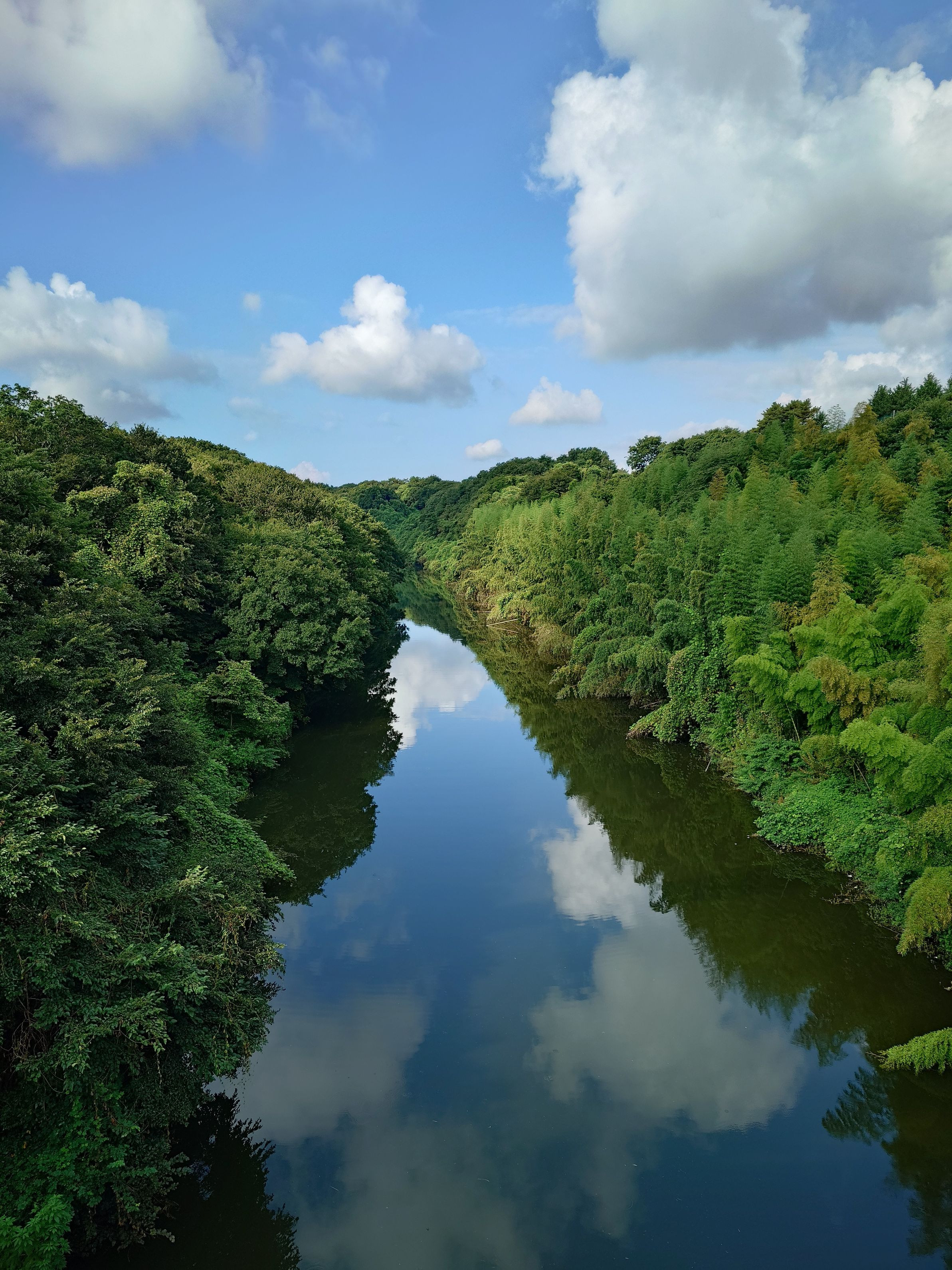 八千代市弁天橋〜花島公園まで川岸の緑地が5km程続いています。 弁天橋からの眺めで、町中に突如現れる風景です。 秘境感があり、夏の草木の成長の力強さが感じられます。川沿いの木陰をランニングするととても気持ち良くておすすめです。