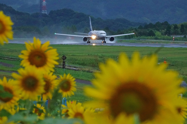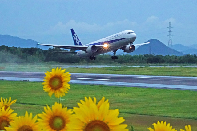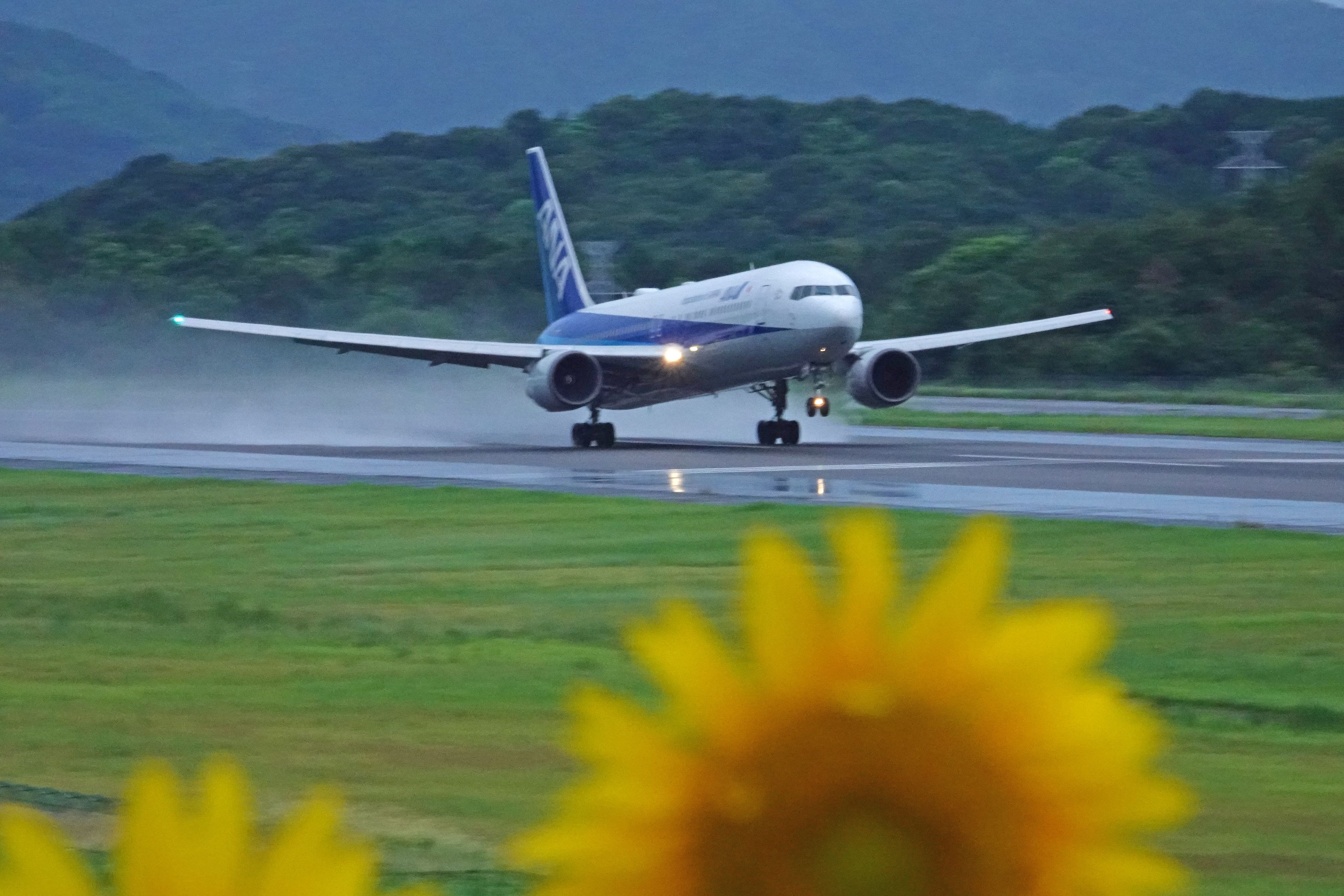 雨降る高松空港。 滑走路南側のひまわり畑が満開。 水煙を上げて出発するANA。