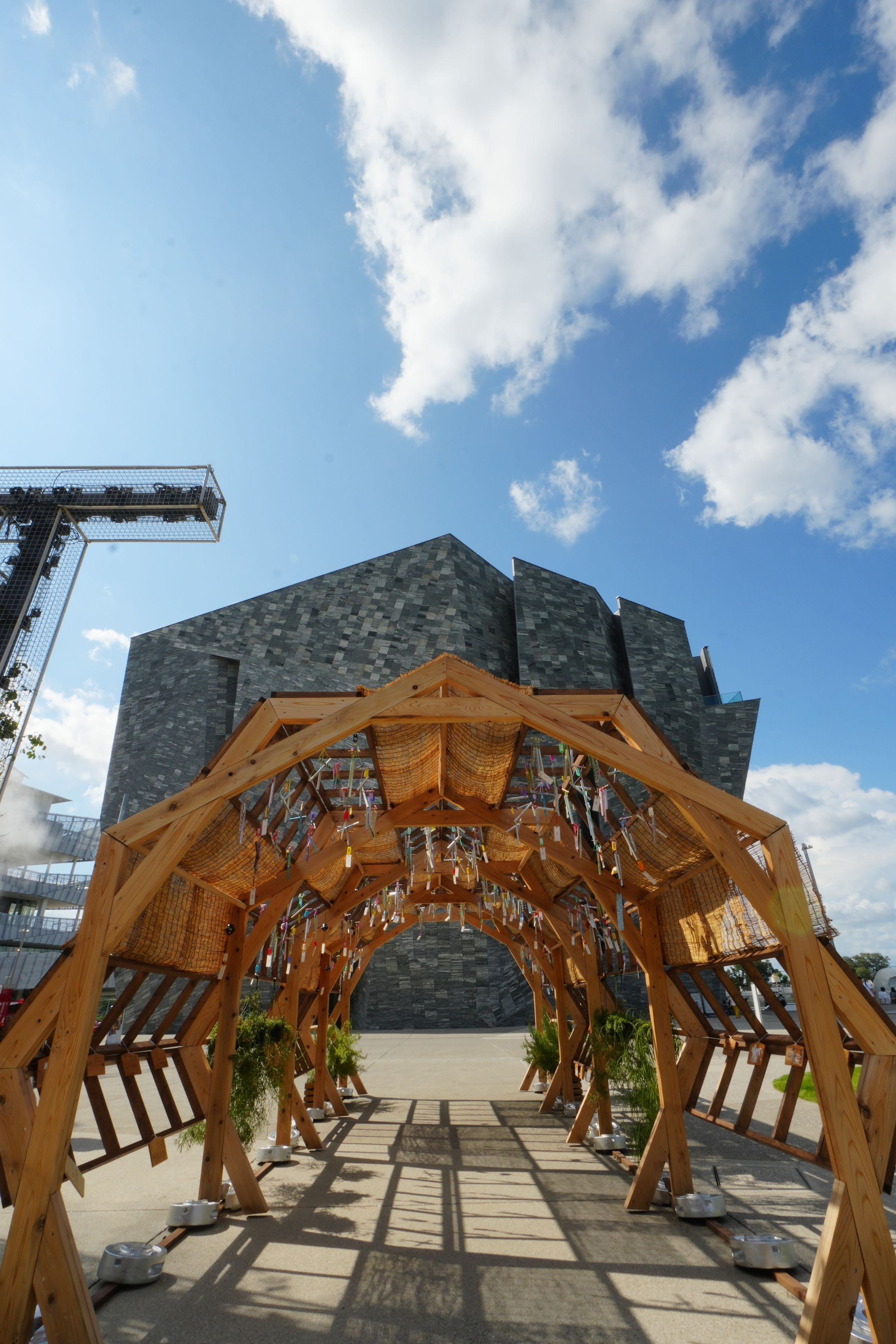 埼玉県所沢市 ところざわサクラタウンにて この夏限定で設置された「風の回廊」から角川武蔵野ミュージアムを望みます
